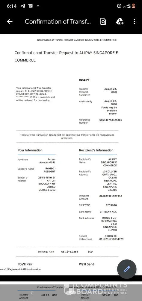 Beneficiary Account number :[protected] on 25th August, 2020 up till now the money has not reflected, the bank in America has called your branch but no one is picking up, please I need this resolved today as my order with aliexpress would be cancelled and you would have to refund my money back to resident, I also told my cousin to take legal action against your bank for this. because your bank is causing me financial losses (Recipient's Information