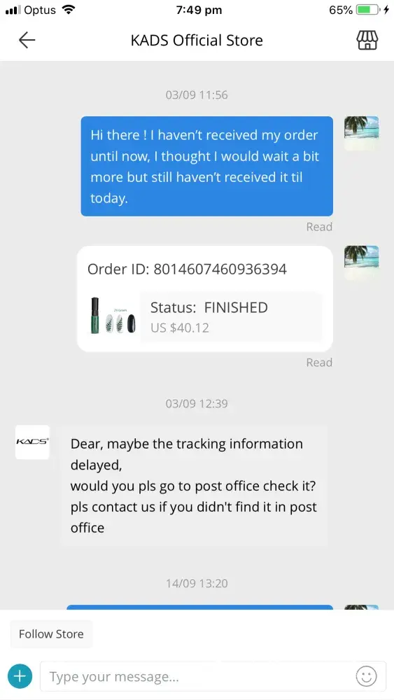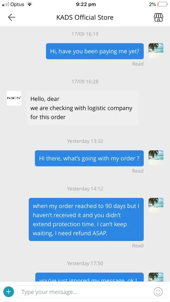 I've made an order on 25/05/2020 for KADS stamping polish, Order No is 8014607460936394 and I haven't received my order after 3 months, I didn't realize my order had passed protection time but the seller didn't extend protection time so that I could open a dispute after not receiving my order. i have been contacted seller for a refund, seller offered to resend products to me. I said what happen if they get lost again and seller changed his/her mind to ask my Paypal account . 2 days later, seller change his/her mind again to offer me other products instead of my KADS stamping polish (seller said: because they are liquid, it takes long time to get to Australia).