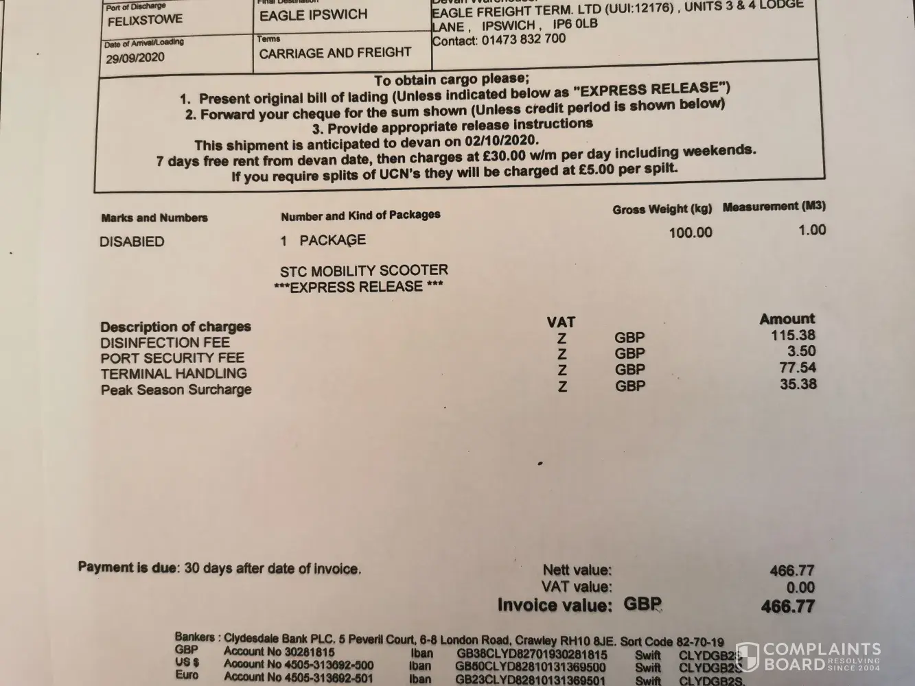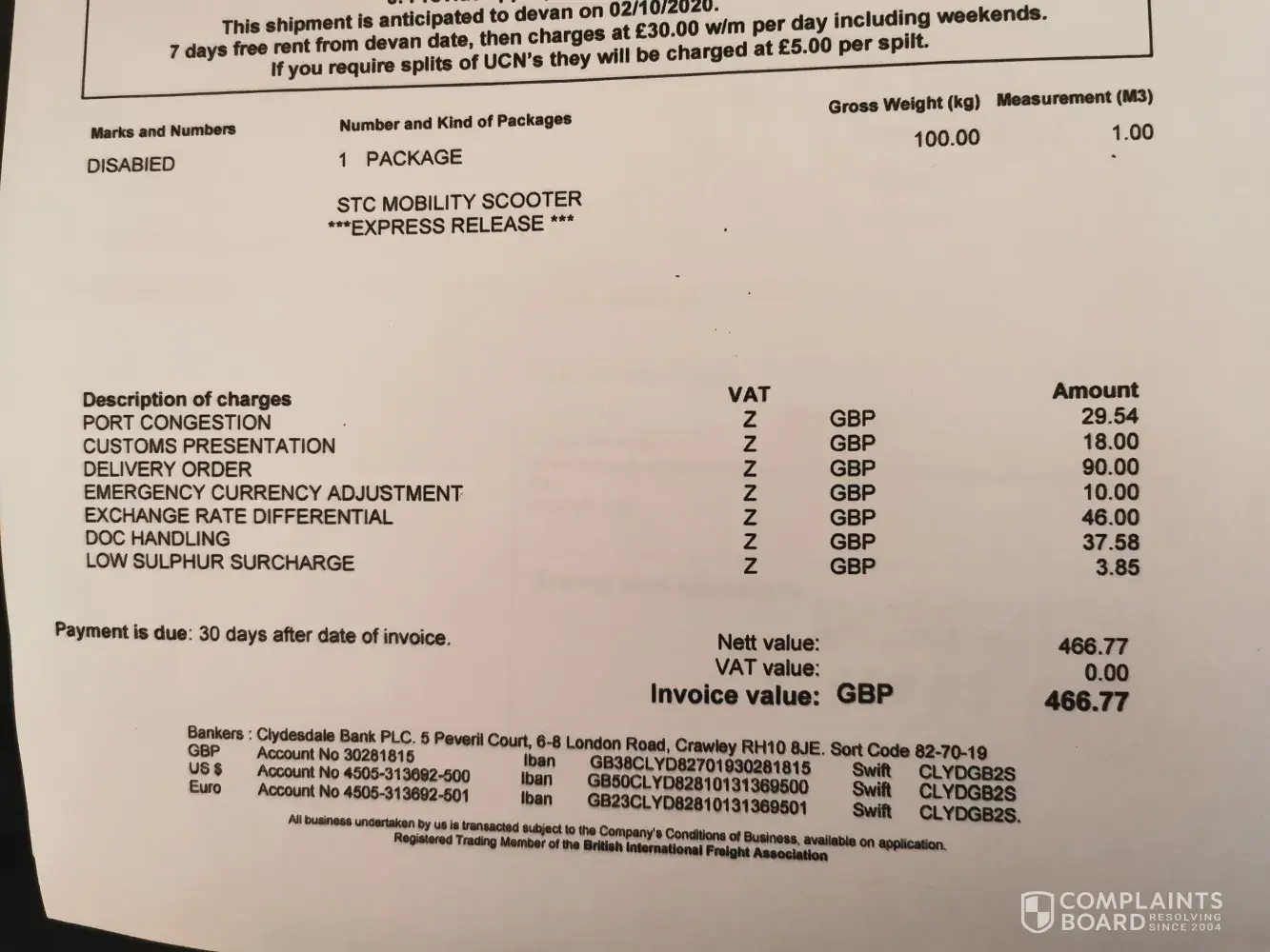 Order time: 09:49 Jul. 12 2020, the order was sent out to the china sea port and I was sent the b/l number for tracking it, but was not put on the ship as the shipping company coscos refused it because it had got battery's on the scooter and they cannot transport batterys`s, no one told us this until I waited 4 weeks when the ship arrived in the uk port only to find out the mobility scooter was not on the ship, the seller told me we had to put it on another ship, so now I had to wait another 4 weeks, the mobility scooter as now arrived at Felixstowe shipping port UK. I ask the seller to send me the B/L number for tracking it, they sent me the details so I contacted my shipping agent Brunel shipping london to let them know, Brunel shipping sent me emails to let me know they will be taking over the cargo and get it through customs and deliver it to my home, then they sent me all the invoices that had to be paid before they could proceed with the order, when I got all the invoices I ask them to check if that was wright, yes they say but they did tell me they will be checking up on the invoice from the china shipping agent that was for £466.77 as they could not work out what the charges was for, my invoices are > £466.77 china shipping £231. my broker fees for import and delivery, this is ok and no problem with this, £112.35 for VAT import (we will be claiming this back as we are disabled and do not pay VAT for goods that are for disabled use only) £25 for use of deferment. TOTAL= £835.12 paid in full on the 7/10/2020 please see all attachments invoices, we are looking to claim back the £466.77 that we was not told about or what this is for.