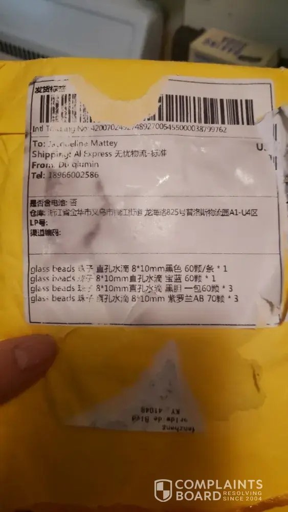 I received my package yesterday 9/3/2020 but it was missing 3 packs of violet beads. There was a label from my post office covering up the aliexpress label. I managed to expose the original label. I translated from Chinese to English and it clearly stated to eliminate the violet beads. Those are the ones that are missing. I opened a dispute and uploaded all my evidence including the original and the translation. Aliexpress found my claim invalid. I've been missing a lot of items lately and I dont want to shop with aliexpress any longer