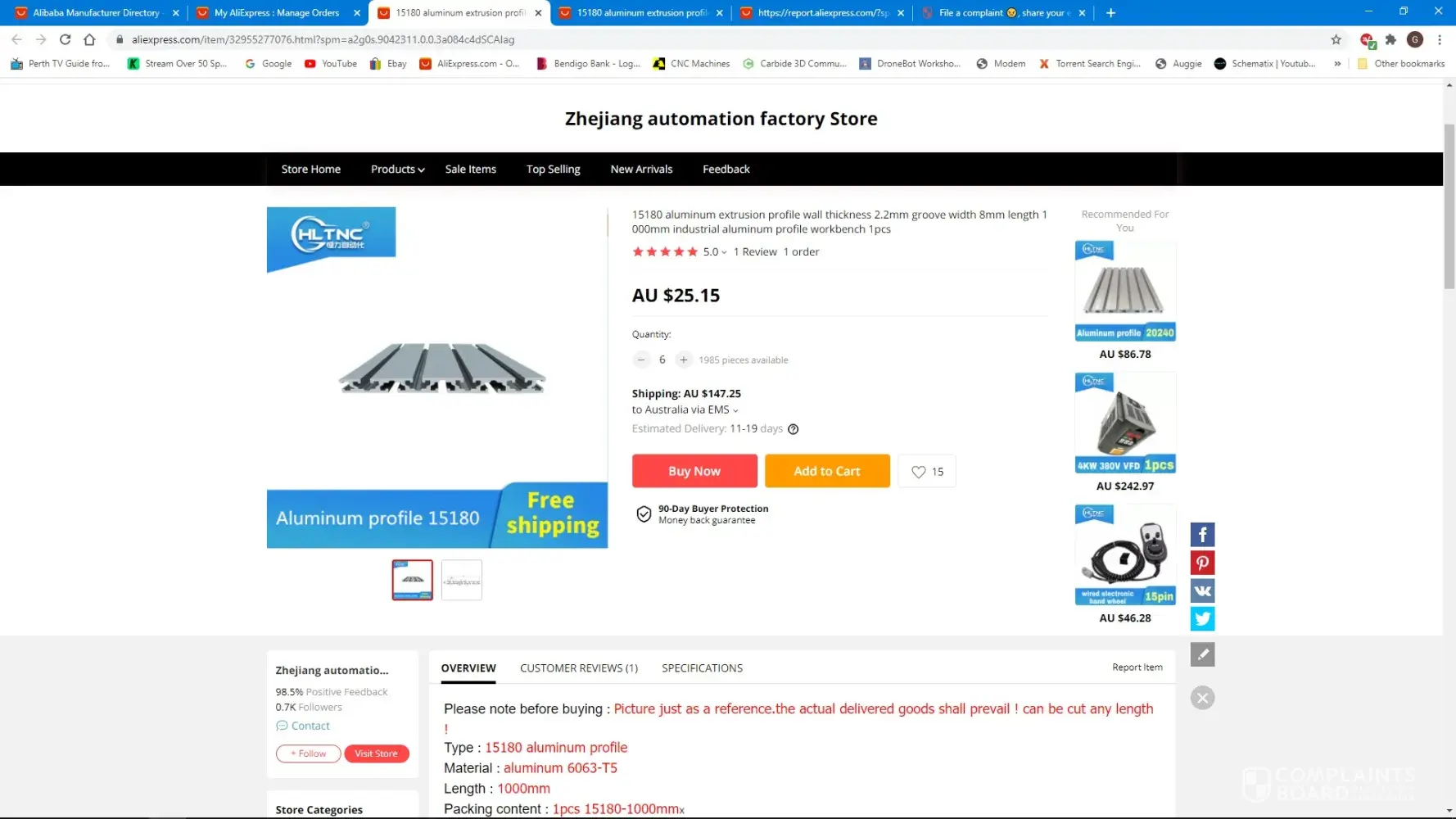 I made a purchase on September 10 of six lengths of 15180 Aluminium Profile Extrusion from AliExpress listing by Zhejiang automation factory Store.