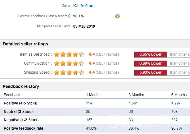 K-Life Store (https://www.aliexpress.com/store/feedback-score/5048004.html )- rating 90.7%, but if 4297 positive feedbacks for 6 months divide by 5057 total feedbacks = 85.0%
