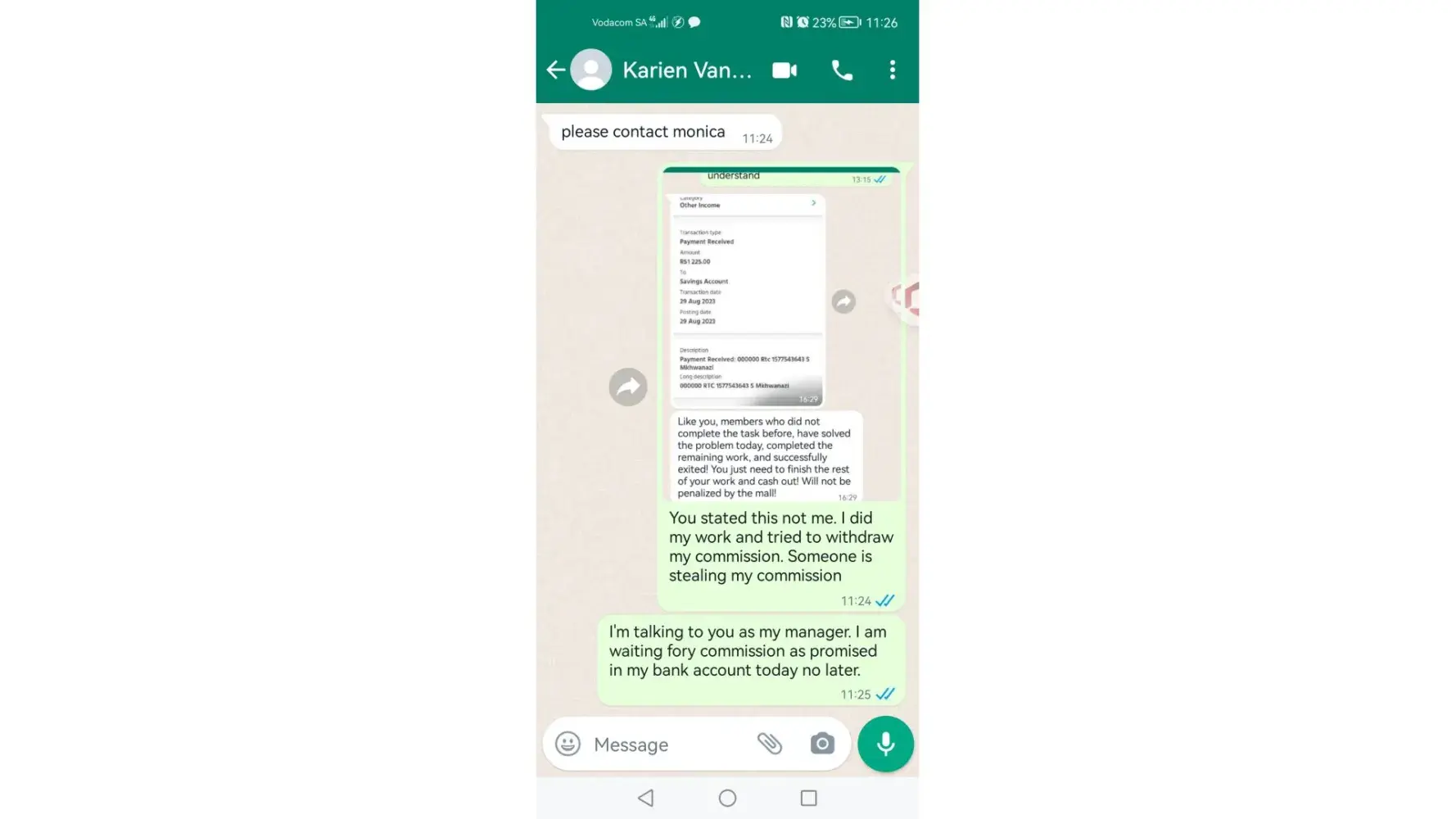 I have for the last 2 days been begging my manager Karien and the other woman Monika to assist me with getting my earned commission tra4to my bank account and sadly have to stop working on the platform for commission based.