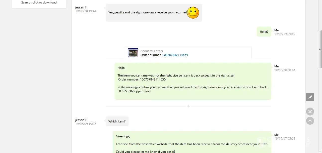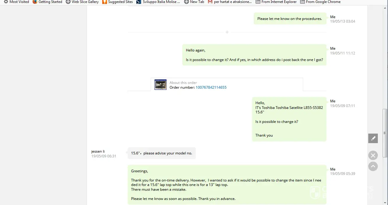 I ordered a product at Jessen Engineering Co.Store on April 18th, 2019. I got the product in time, but it wasn't the right size. The product was a computer case which was smaller than my computer, although I had specified the size to the seller. However, I sent them a message and they told me that they can change it once I send the right one.