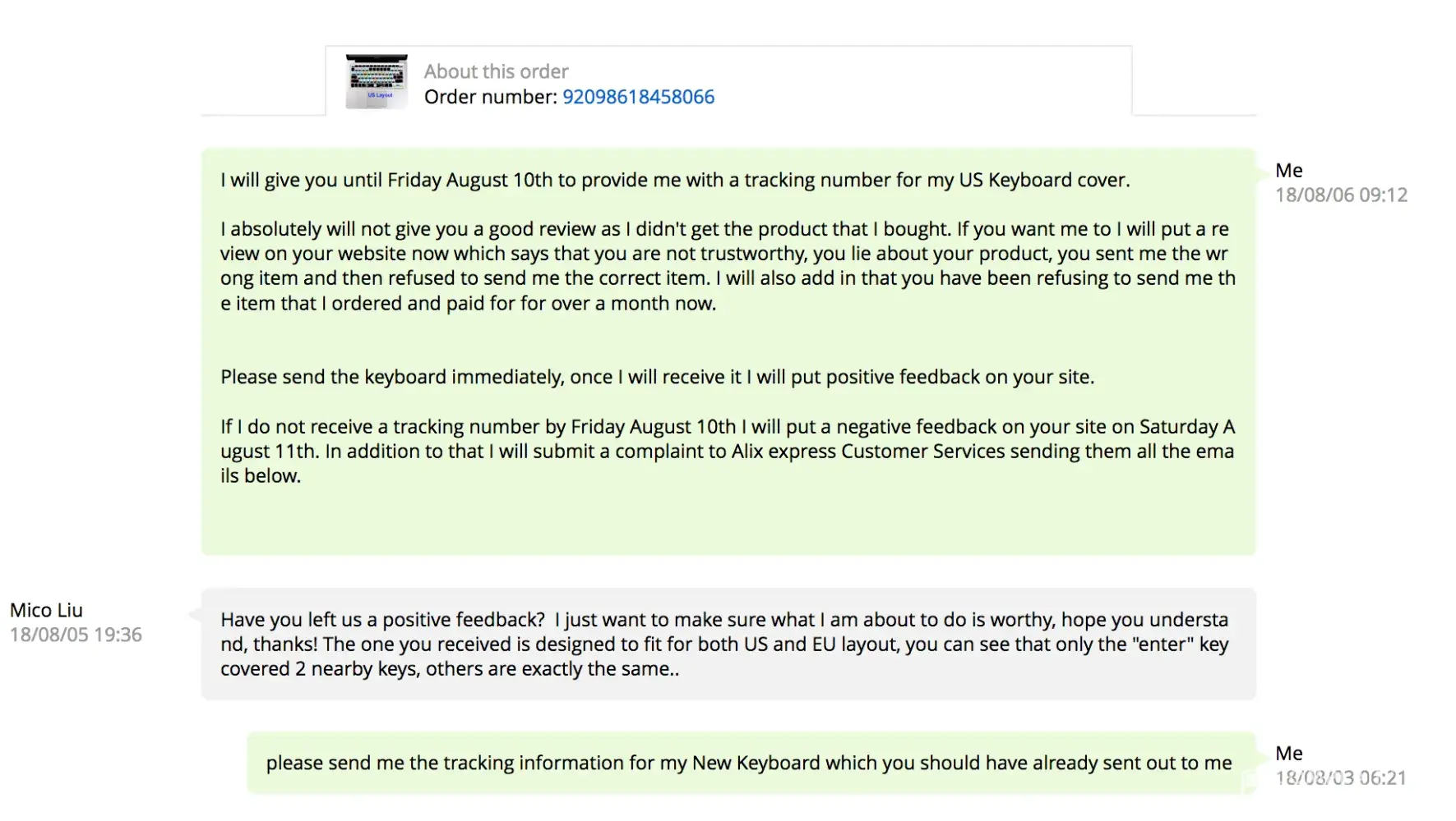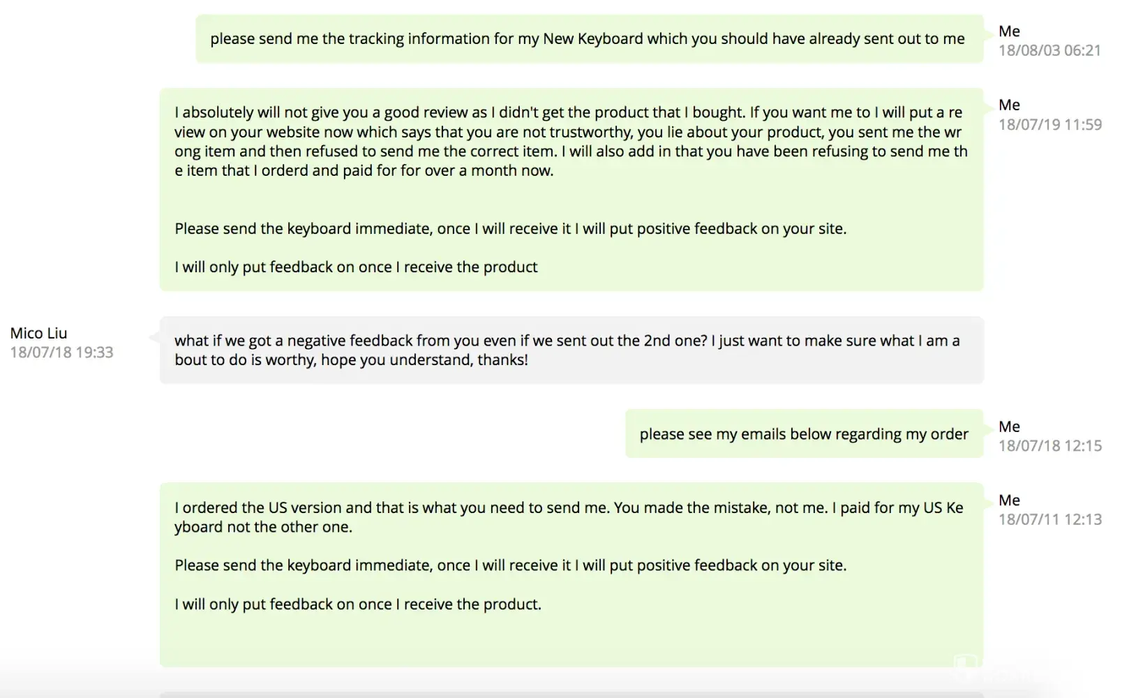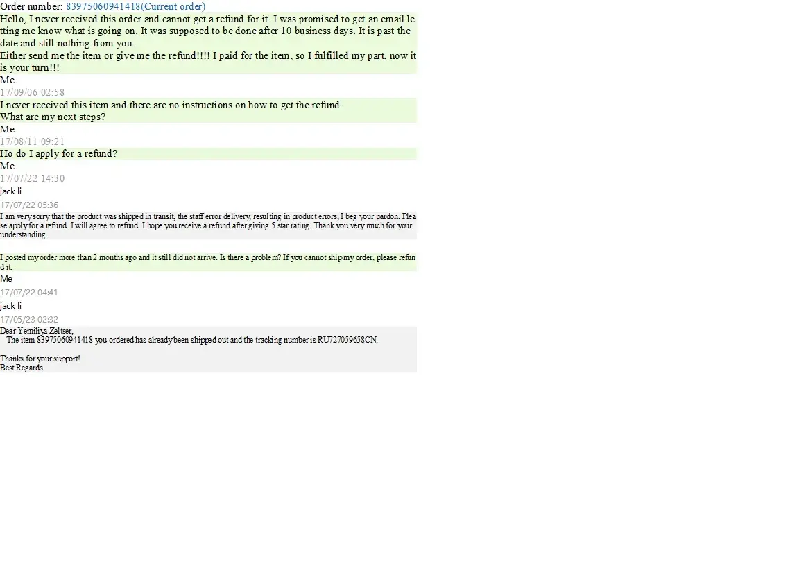 After that Demi Li kept me sending questions and asked me for photo's and video's. But he never offered a solution. He kept me on a leash until my dispute time was over.