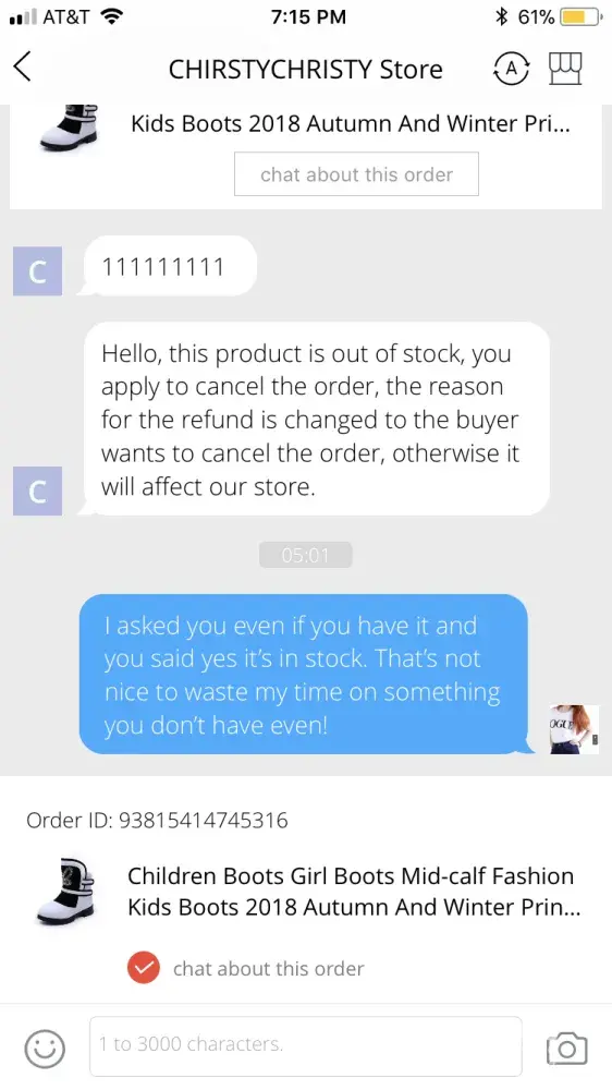 I wanted to order boots for my daughter, before ordering them l asked the seller if he has boots in stock. He answers yes, so right after l got the answer l ordered the boots and paid for them. After couple hours I ordered them the seller said the boots out of stock. I tried to cancel order, and put the reason out of stock. The seller rejected it and didn't refund me. He wrote l need to write the reason - l don't want boots anymore. I tried to cancel my order again and put the reason out of stock. Because that's what seller said that they don't have boots in stock. I want my refund now.