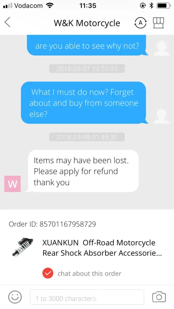 I bought this shock absorber from ‘W & K motorcycle' on Aliexpress. Once payment was processed I was told by seller to be patient in awaiting the receiving of the goods. After 4 months I contacted the seller to query my order. I did not receive a response. After a month following that, I again asked on progress. He then told me the item may have been lost. When I tried to open a dispute on aliexpress I was not able to do so, as ‘disputes can only be opened up to 15 days after you have confirmed receiving your items'. At no point did I ever confirm receiving the goods on the app or website. I have now lost $56, with no option to dispute or request a new item. If this is not resolved I obviously would never consider using aliexpress again, despite it having a great range of products.