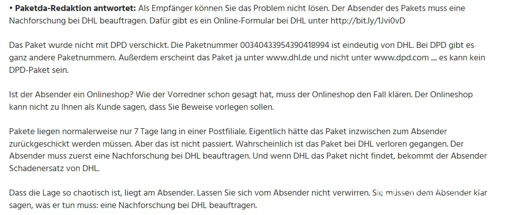 In Germany only the sender is responsible to ask for an enquiry, then i can't contact the shipping company, only the seller can do it.