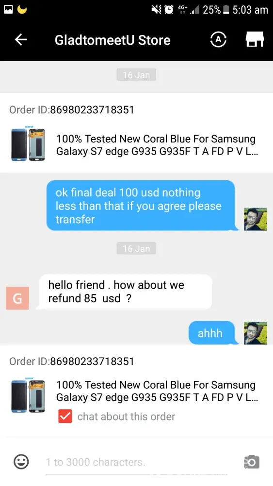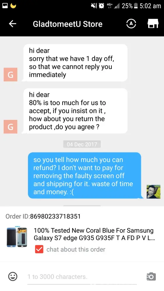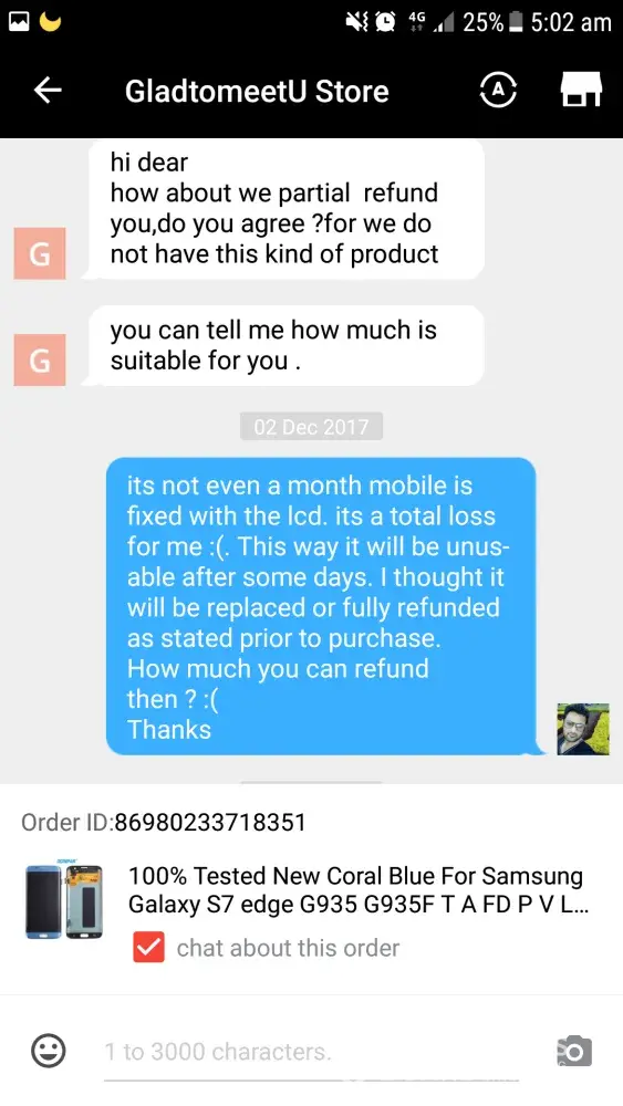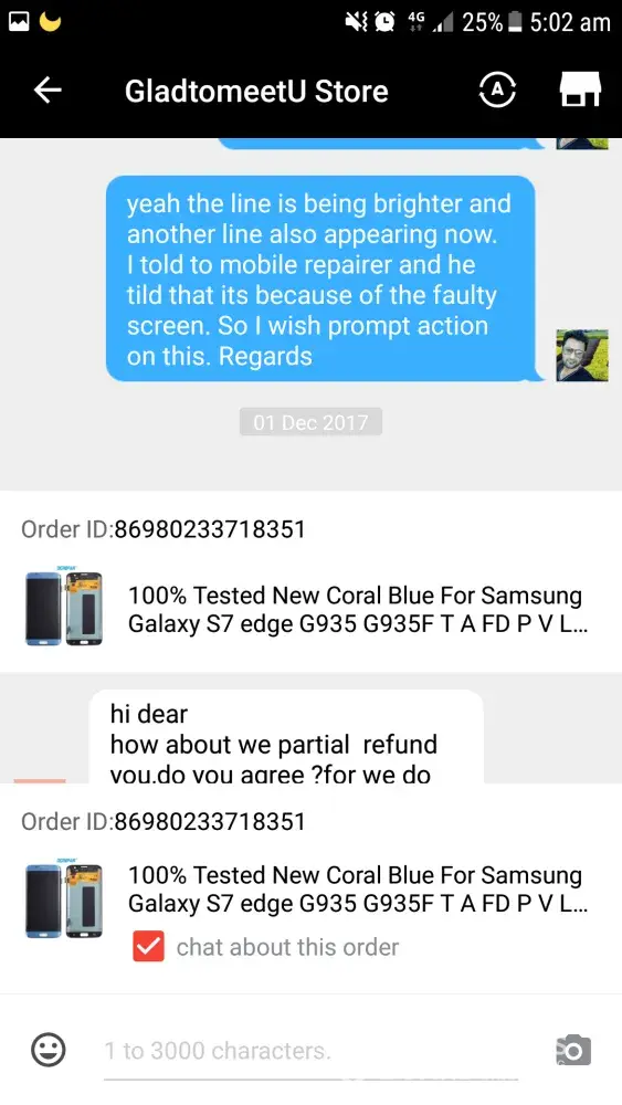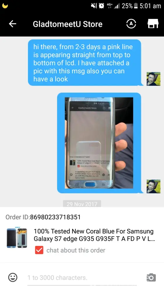 I had bought an LCD screen for samsung galaxy s7 edge order ID [protected] after using some days a pink line appeared from top to bottom of screen and eventually went on increasing and ciuldnot use it by now. When the line appeared on screen I talked to the seller about the faulty screen but they said they donot have another product to replace and as I have used the faulty LCD for sometime they will refund partially although the problem appeared within warranty period.