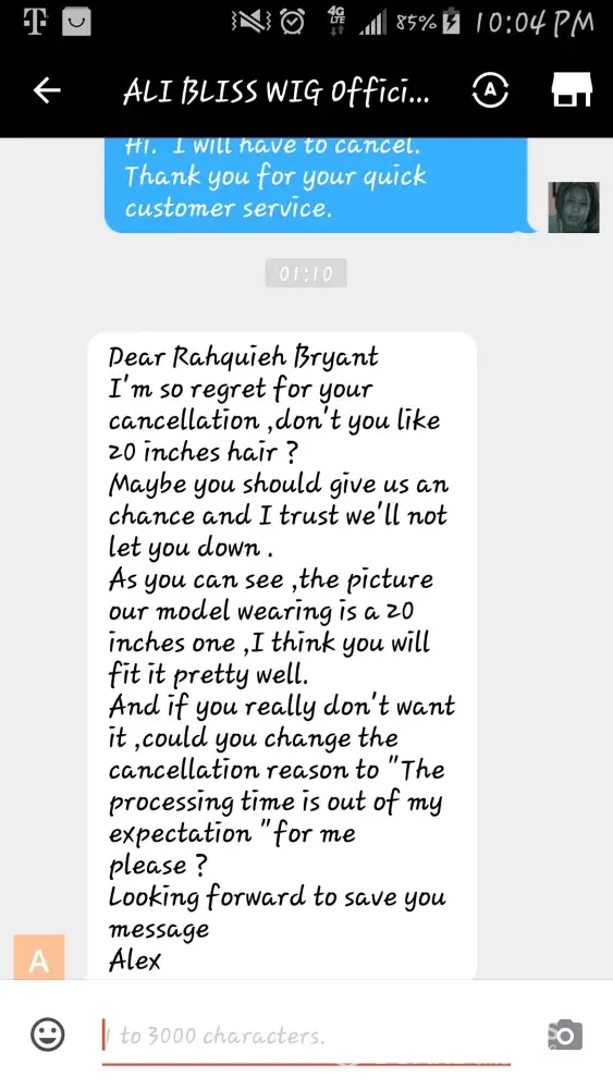 I purchased a wig unit in 22 inches. Alex contacted me and stated that, the 22 in. Was out of stock and asked if I wanted a 20. I stated I would need to cancel. I cancelled and stated the reason as "Out of stock" Alex contacted me to change the reason. I at first declined and after I seen he was not going to honor my request to cancel, if I didn't change the reason I changed it.