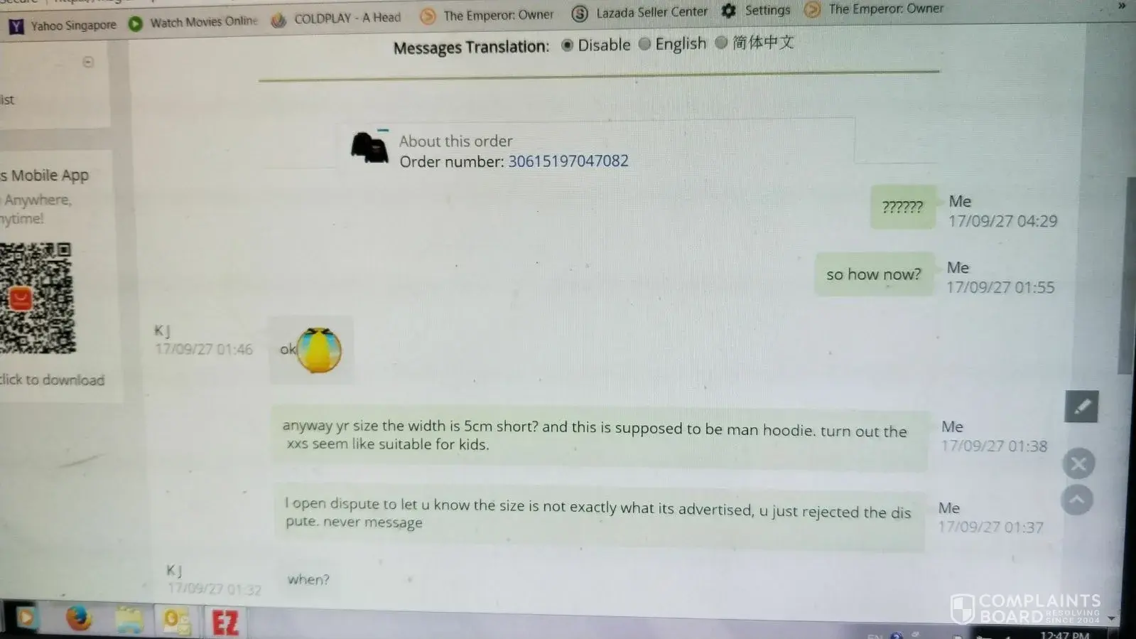 open dispute seller nvr reply, until i wrote to mgt case when they ask me for evidence, seller reply to me ask me close the case and will refund. i nvr reply case mgt thought seller will refund. but when pass the deadline, no refund i ask seller he blame plateform. and now he nvr reply me at all even customer service wrote to him many times. i had went to live chat and repeated almost 10times but everyone at start assure me they will get it solve and thats the last time. but now most of them made me repeat and kp asking me for evidence which i had already submitted. its my 1st time i hving seller do not reply to me and ignore my queries. diff by 3cm i understood, but its adv as man hoodie so definately for a gal should be xxs.