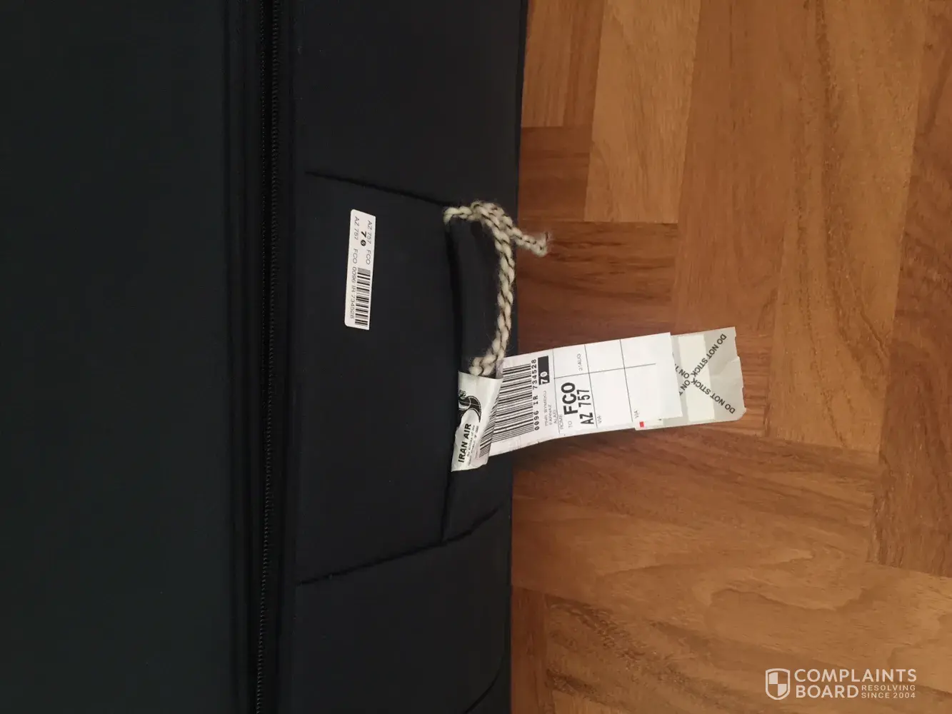 The Alitalia file reference is FCOAZ54768, flight AZ0603 - 04, ticket number is [protected], tag number is DL835091. File reference 05 oct 2017 09:05 LT