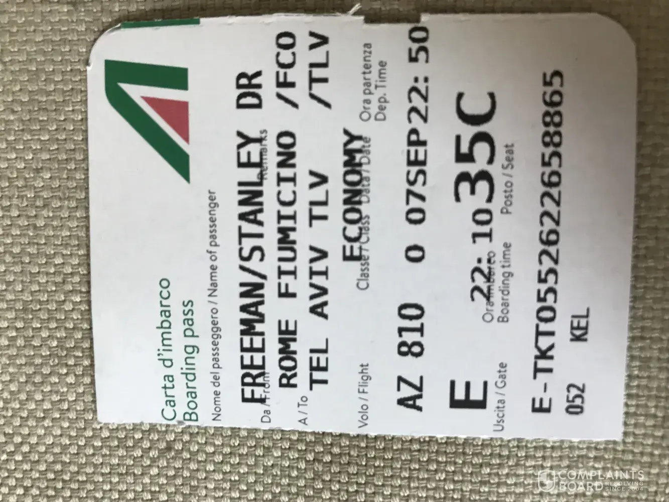 My flight from Bari AZ1608 was supposed to depart at 07:25 am for Rome to connect with flight AZ806 to Tel Aviv at 09:35 arriving before the Sabbath at 13:50 pm on Sept 7 2018. Instead there were technical problems and the plane only left at about 13:30 pm for Rome. I was placed ONLY on a flight, AZ810 at 22:50 pm (on the Sabbath night) on Sept 7 arriving in Tel Aviv on Saturday 8th at about 3 pm. No public transport was available to arrive to my home was available so I needed also to take a taxi costing 270 NIS home arriving at 04:30 am ! There is absolutely no reason to suffer such consequences and duly I expect reasonable compensation for travel on Sabbath with a delay of over 12 hours and a poor food voucher that covered half a meal costs while I had expenses of at least 2 meals. Boarding cards attached.