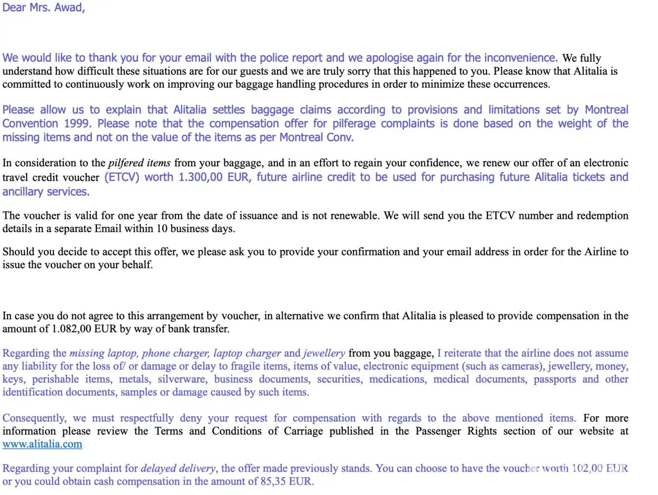 my baggage was delayed which causes missing items from my bag laptop, phone charger, laptop charger, and jewelry which values more than 5, 000 EUR. you offered to provide compensation in the amount of 1.082, 00 EUR by way of bank transfer.
