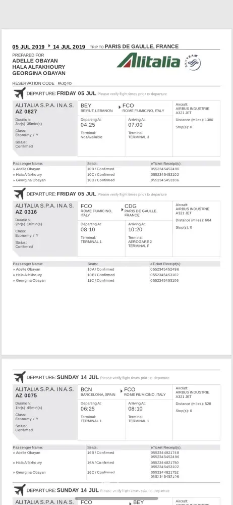 We were traveling on your airline today on the 5th of July 2019 we had 2 flights 1st one was to roma AZ0827 and the second was AZ 316, reservation code: FAJQYO in the name of Adelle Obayan, Georgina Obayan and Hala AlFakhoury, we were ar beirut airport around 1:45 am and we put three bags at the checkIn but when we arrived paris we noticed that only two bags was received and the third was lost so we went to make a claim at the airport but they noticed that at check in the employee gave us two codes for two bags and not three and advised us to send you an email and make a claim, so you are kindly requested to make the necessary and find our bag for any further information please contact me on number [protected]