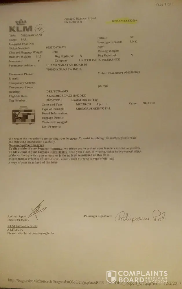 On arrival at Amsterdam, we received our checked in 36" suitcase in badly damaged condition. Your Schipol Airport Agent KLM issued a damaged bagage report vide File Ref. no. DPRAMSAZ32094, wherein they have certified a compensation amount of Euro 300/- as no replacement of bag was made.