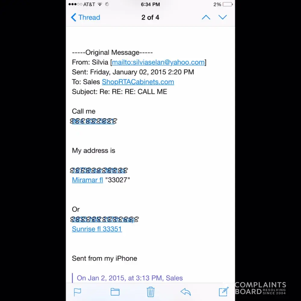 4. Repeated emails back and forth. They always claimed the cabinets were shipped out, but would never give me a requested tracking # 1/26/2018