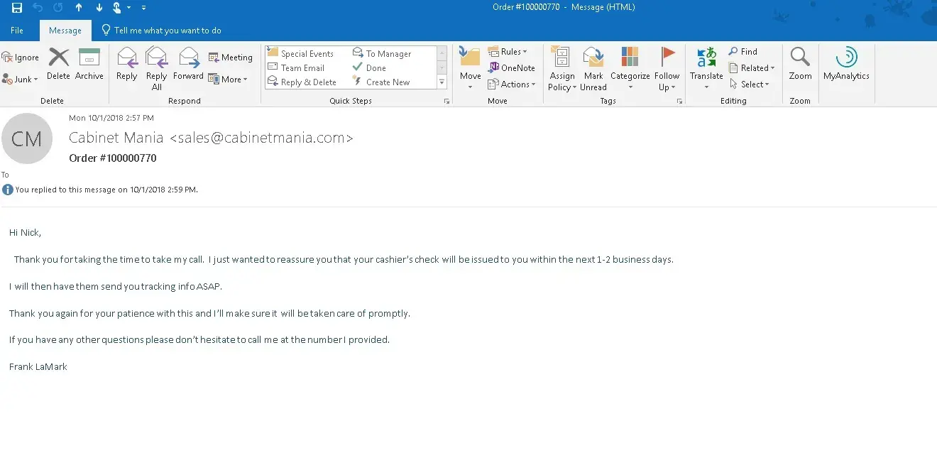 11. March 16th, informed Cabinet Mania LLC the check was NOT good, they said they had a customer bouce 2 large checks on them and they would get us a cashiers check delivered to us via Fedex and we would receive it by the coming Tuesday. Which would have been 3/21/18 . It never came and Fedex says that is not a good tracking number that Cabinet Mania gave us.
