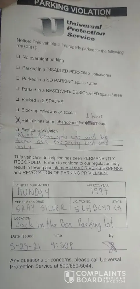 Tired of this coming from them because I'm homeless when I went to Jack in The box I ate dinner and when I came out 10 minutes later I had a thing saying that they were going to tow my car in an hour but I was only there for not even less than an hour after receipt I'm tired of this every day