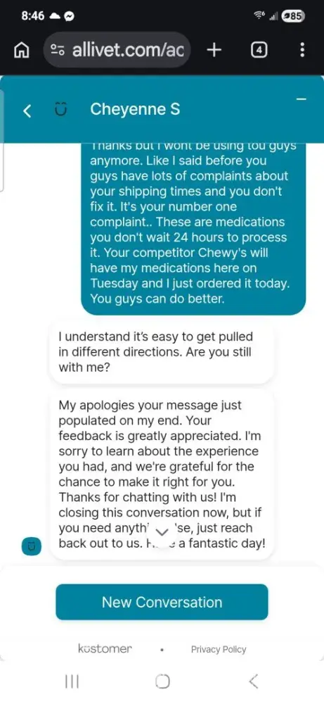 Honestly, this whole thing was a hot mess. The only good thing was that Holly didn't hang up on me like the first Chat Rep did. But seriously, if you've had a good experience with Allivet, count your lucky stars. I can't recommend them based on my experience. Yeah, their prices are good, but their Customer Service needs some serious work. My poor pet needs that med and I can't wait around for them to get their act together.