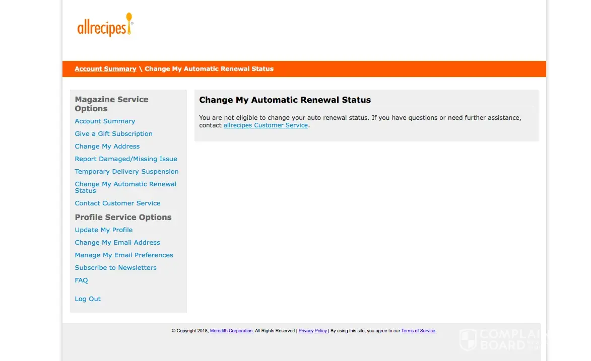 I called AllRecipes and left messages twice and did not receive a callback, and I emailed [protected]@cdsfulfillment.com and attempted to follow the instructions to cancel my subscription only to discover there is no mechanism to do so (see screenshots below). There appears to be no mechanism to cancel my subscription on the website even though AllRecipes claims it allows members to cancel subscriptions. Moreover, like other companies (sorry to say) AllRecipes does not issue notifications prior to auto-subscribe.
