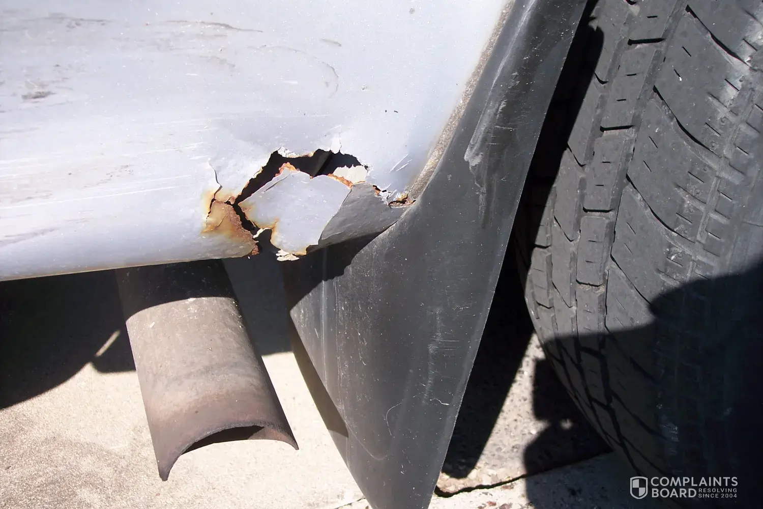 The hole only showed up after the impact, so the adjuster indicated it what visible prior to the impact, It was not. The hole opened was a 2x3 inch area right behind the right rear wheel and did not even disturb the wheel well where the mud flap attaches. ( Pictures available ).After talking to some body shops they indicate that the two areas where being treated as two separate repairs--they are all on the same panel, and not of equal damage. The expert body people wondered why the smaller hole was 50% of the estimate. They said to " plug the small hole and weld a new plug in place and then continue with the repair." is more logical. This certainly was not a $562.23 repair with plug and labor about $250.00.