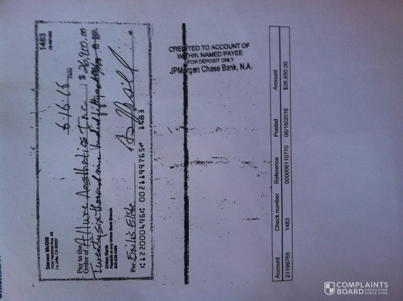 Our check number #1483 deposited in his account on 6/16/16 fro $26, 950