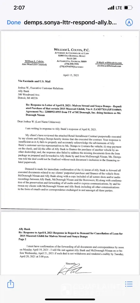 Disabled army veteran and currently a stage 3 ovarian cancer patient that currently takes chemotherapy pills everyday with already taken traditional chemotherapy treatments I was scammed by this dealership on february 17th 2021 fake forgery contract forced and threaten to take possession of a car that had issues 10 mins later which is for a 2015 masareti they have pushed a contract through and got paid and towed the car to my property twice no keys no insurance no contract they lied to the bank I need help asap. I am banned from their property because we exchanged words because I did not want to do business with them and they still did forgery and the finance manager signed my name without my consent on documents. Please help me.. I never took possession of the car they snuck it in to my residence to get paid from the finance company. I did not have the car 12 hours.. I was given a citation for disorderly conduct for throwing a fake contract and forgery contract at a sales manager antoine tarpley that was being disrespectful with threats trying to force me to take a car.. Threaten to put me in jail tried to put me in jail as I stated got me a citation for nothing. He is a crook he is rude he cussed the sales person our in front me. Also the man name chuck is horrible and terrible he is rude he hung up the phone in my face he said he don't car about no lawyers, no media, no corporte complaints no nothings I have videos is them almost breaking my gate to sneak the car in I caught them friday morning february 19th and tanned them out with that car and called the police to file a report and the man name chuck told me that's my car and I am towing it to you residence regardless he said he don't car. He said they been paid and that's all that matters because a payment when come up and they know I am not paying it and they will repossessed the car and get double their money. He told my spouse that if he calls up here complaining he was going to guile charges against him did harassment. Chuck which is the gsm and other sales people needs to be fired and thrower in jail at mcdonough nissan the gm was the one that called the police on me because I threw a a fake contract at his body because he was cussing abs laughing and being rude and disrespectful on february 18th 2021 also february 17th they sit behind that window and ignore you abs send the sales person out there because they don't want to talk after they think they have scammed you out your money to purchase a car. The gm told the police I threaten to kill him when that was a lie the police found out he lied and then he decided when that did not work to say he wanted to press charges against me for throwing paperwork out his rude and disrespectful self and once again they gave me a disorderly conduct citation and criminal trespassing warning not to come back on the property because of the corrupt gm. I have contacted the media friday february 19th 2021 good morning america, fox news and a host of different resources that can deal with this matter legally along with being it to the media so everyone in the state of ga and the usa can see the corruption and scam that this dealership does customers they forge your name add stuff take our stuff don't let you see it they send a person in to distract you on the paperwork add fees they lie they cheat and as you can see they be deceitful I am a customer that's fighting to stay alive every day due to my cancer diagnosis/chemotherapy every day and this is how I was treated. People I am begging you please look at my story and stay away from mcdonough nissan because you will regret it as I do now I have to not only fight cancer I have to fight for justice with this dealership that needs to be shut down forever please stay away this just happened in me a few days ago. I plead with anyone beware the gsm chuck t the sales manager antoine tarpley other sales associates and the financing manager are crooks and scam artists..
