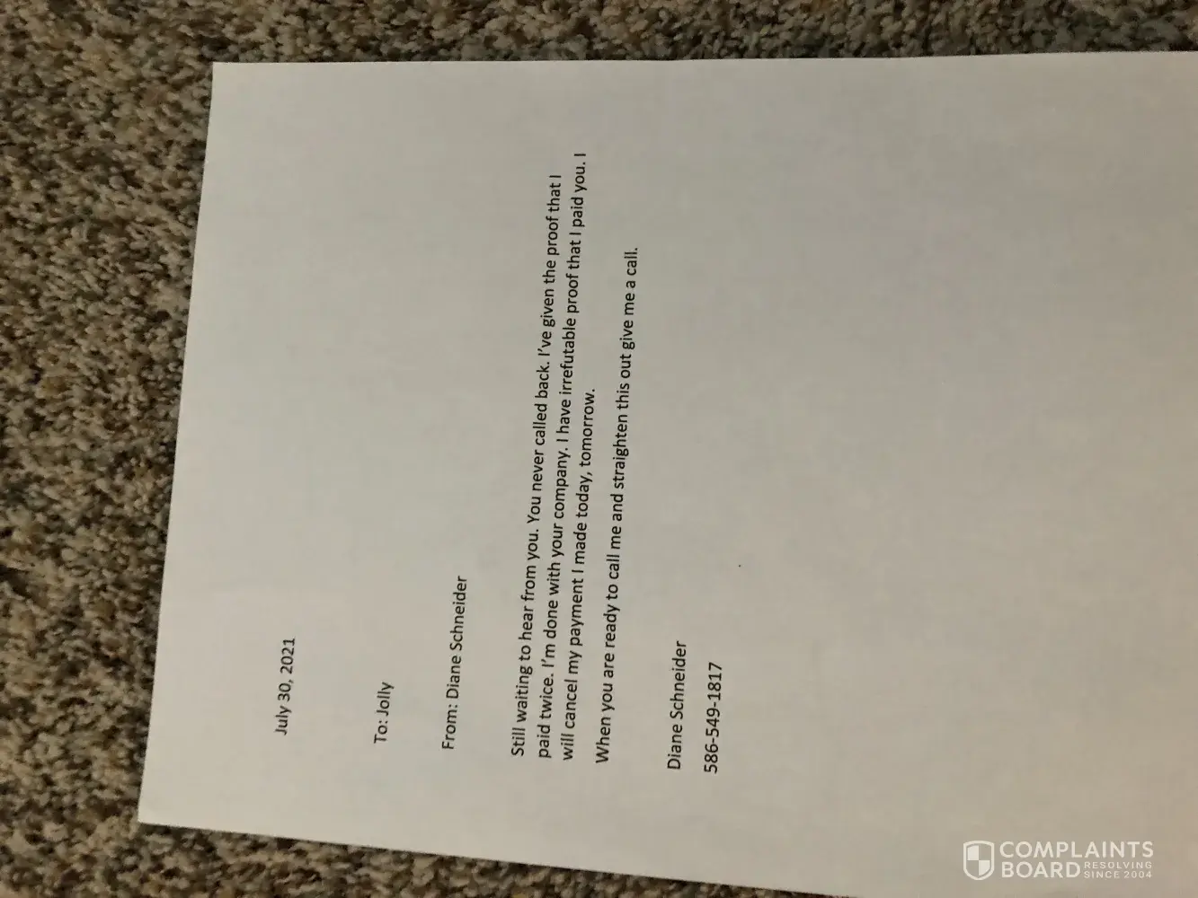 I got her my bank records, showed her the 2 payments faxed her 2 letters to return my calls. I faxed it to [protected]. She never returned my call.
