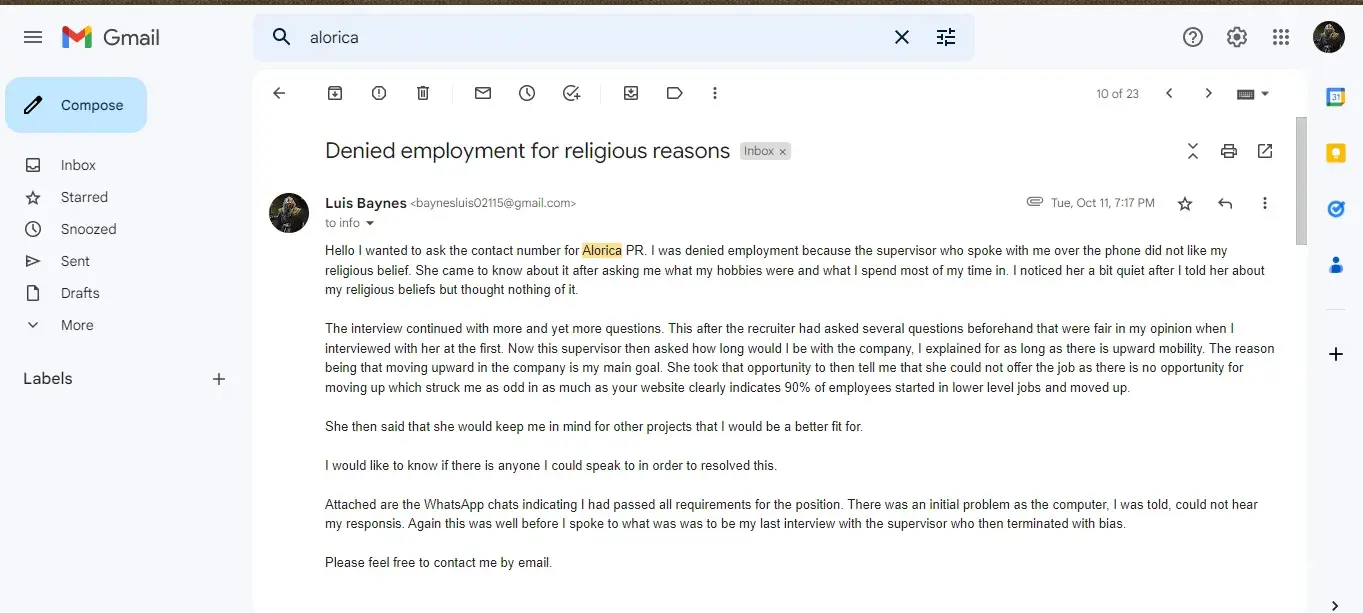 Hello I wanted to ask the contact number for Alorica PR. I was denied employment because the supervisor who spoke with me over the phone did not like my religious belief. She came to know about it after asking me what my hobbies were and what I spend most of my time in. I noticed her a bit quiet after I told her about my religious beliefs but thought nothing of it.