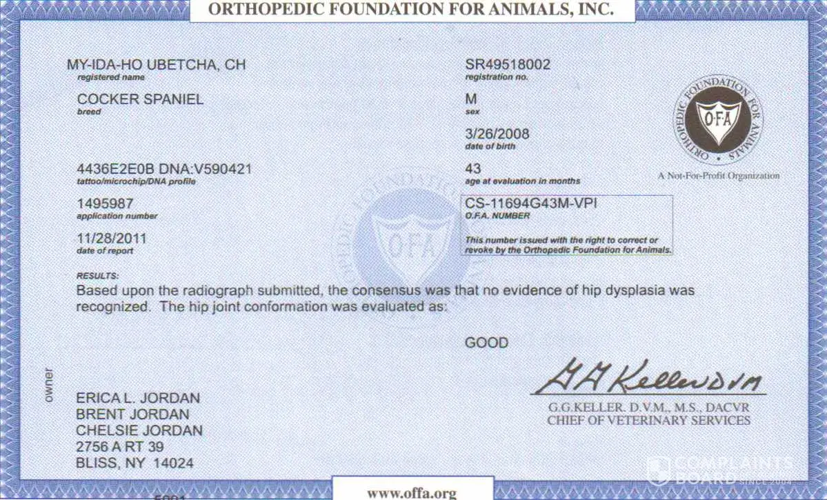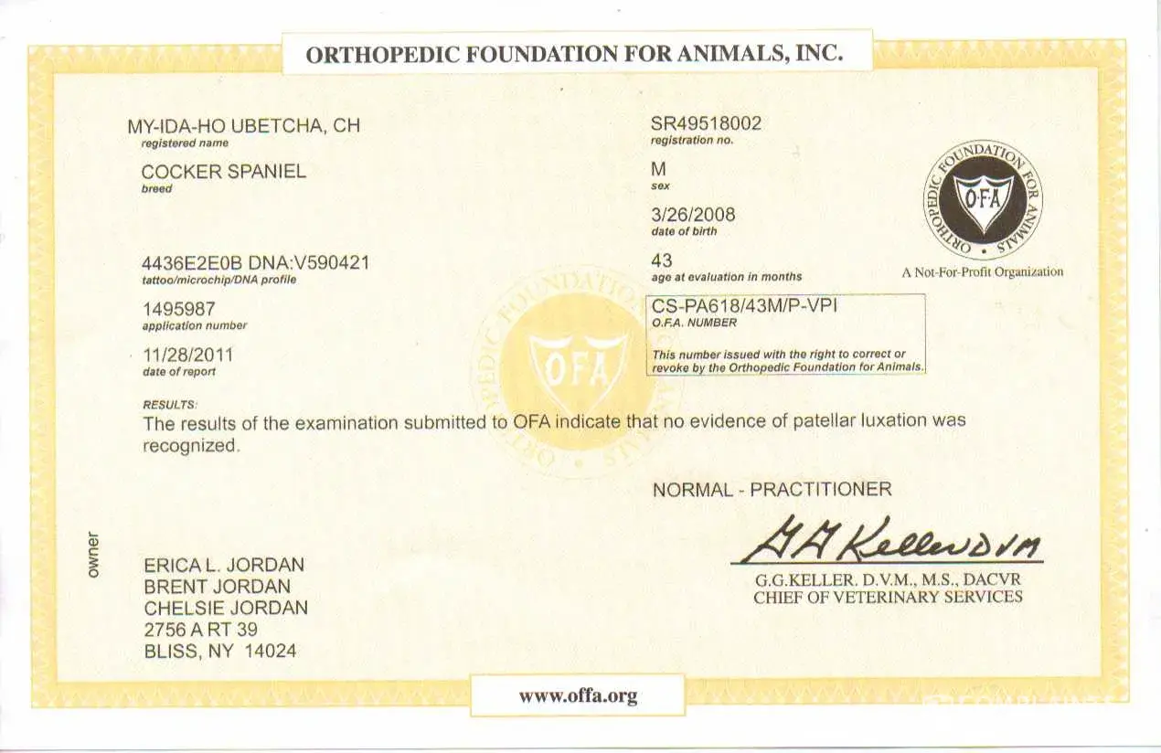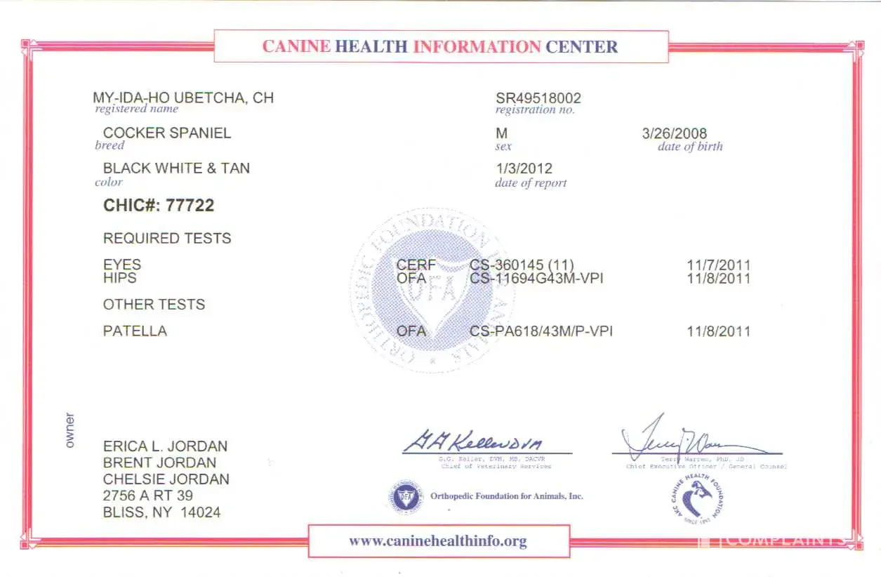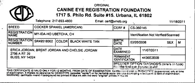 Hi, this is Erica Jordan of Am-Erica's... I obtained a new dog in October and took him for all of his health testing in November. Here are all of the certificates. Thanks for looking! www.americascockerspaniels.com