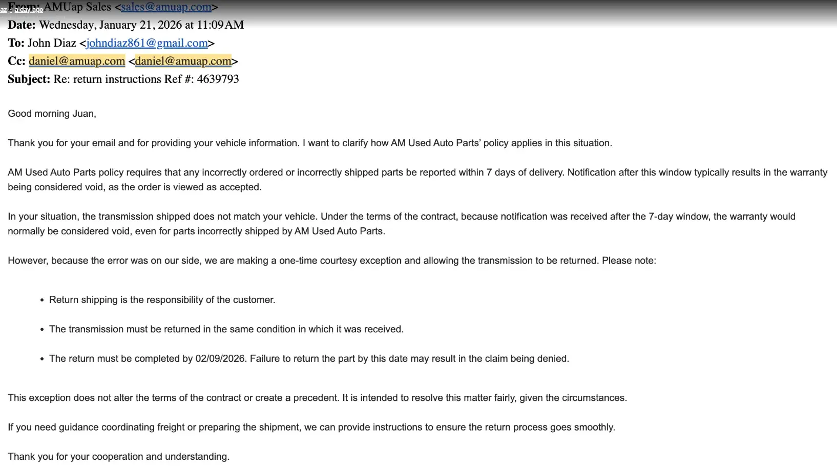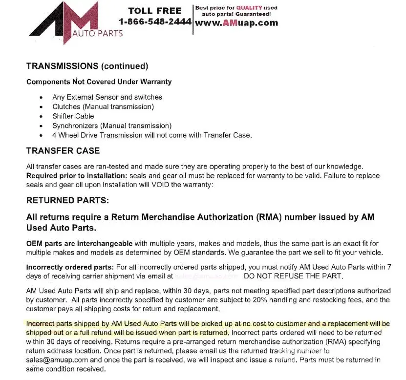 Poor Customer Service and Unreasonable Warranty Policy at AM Used Auto Parts (amuap.com)
