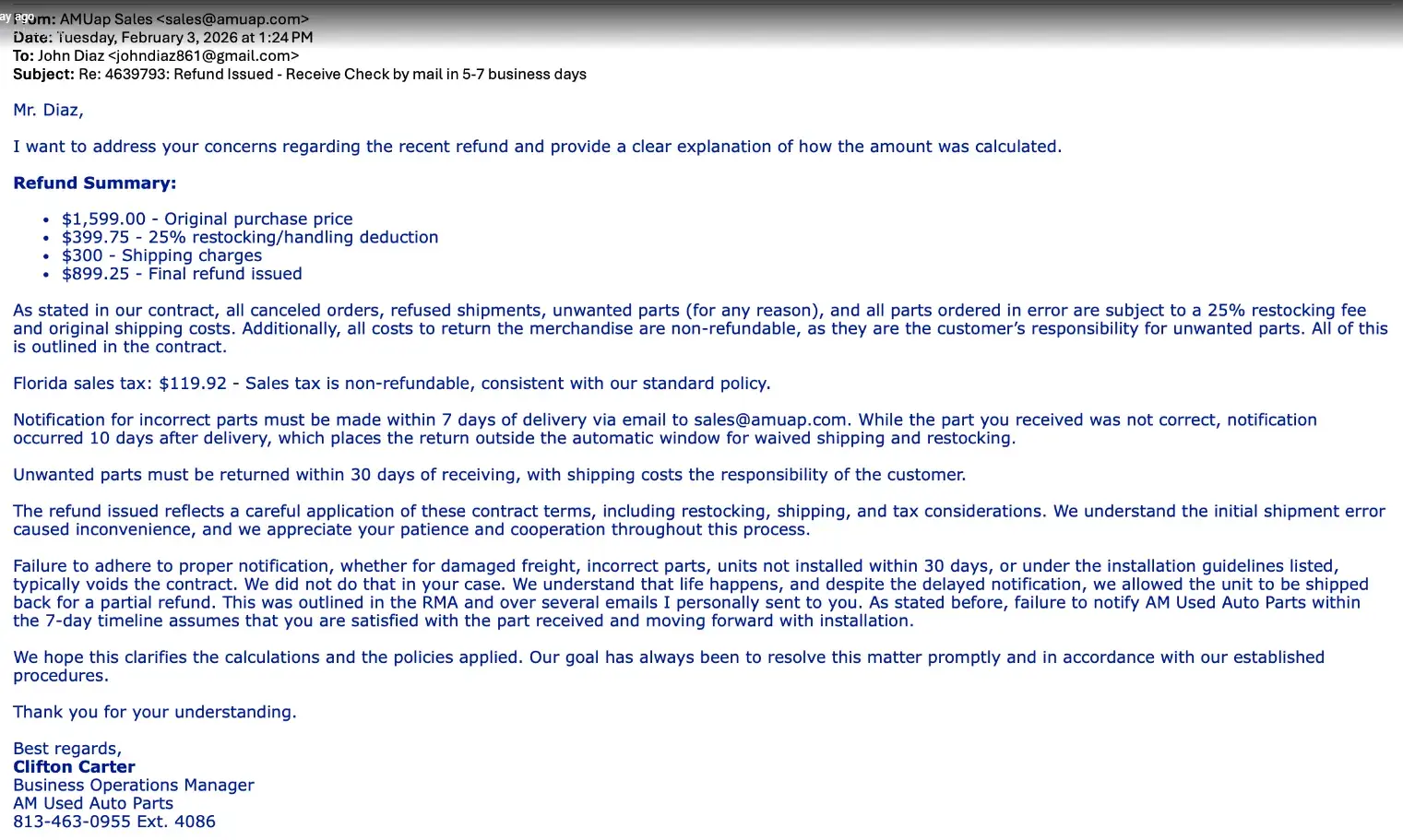 PREDATORY PRACTICES & CONTRACTUAL BREACH: THEY ADMITTED THE ERROR AND STILL STOLE $1,198+ DO NOT DO BUSINESS with AM Used Auto Parts (AMUAP). This company—specifically Business Operations Manager Clifton Carter—is engaged in what I believe is a systematic "fee-trapping" scheme designed to strip consumers of their money even when the company admits it...