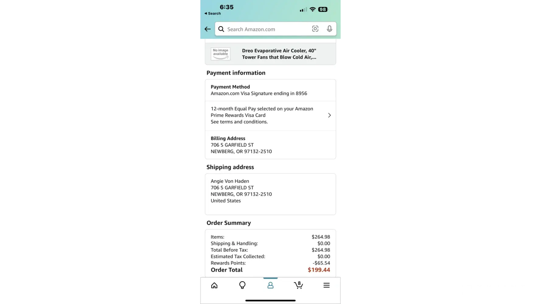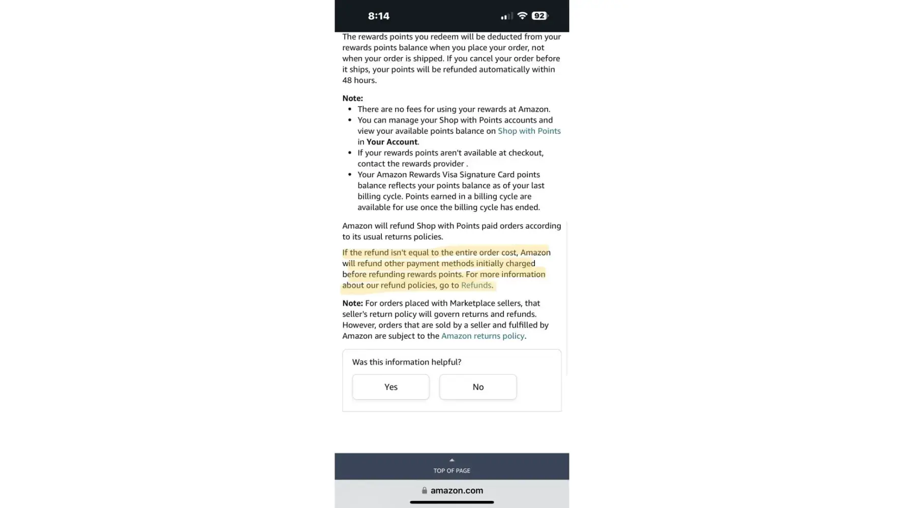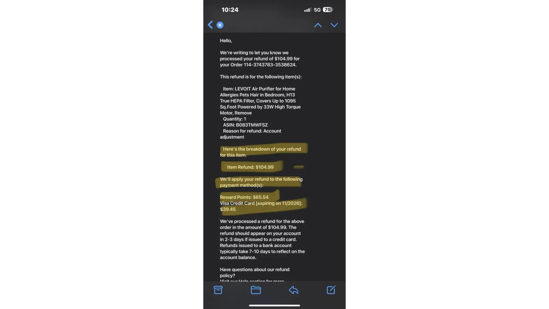 I placed an order on 7.1.2023 for a total of $264.98. I used $65.54 in rewards points and paid for the balance using my Amazon Visa card. I returned the air purifier for $104.99. I received an email on 7.21.23 stating that I will only be receiving a refund of $39.45 as Amazon removed my rewards points of $65.54. This is not at all what I wanted to do, as I still had eligible items in that purchase that qualified me to use my rewards points. This is also a complete contradiction of Amazons use my rewards points return policy, where it clearly states: