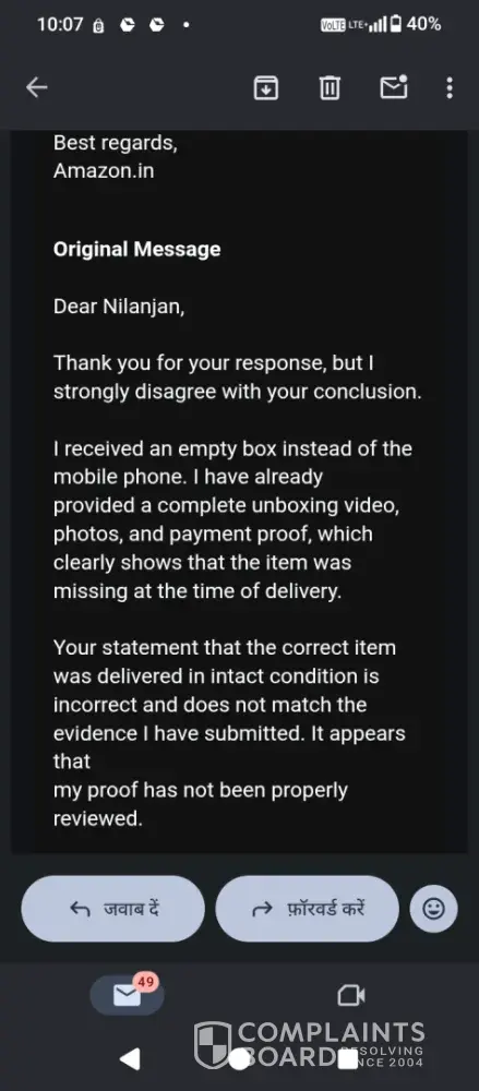 मैंने Amazon से à¤à¤• मोबाइल फोन ऑरà¥à¤¡à¤° किया था (Order ID: [protected]), लेकिन मà¥à¤à¥‡ डिलीवरी के समय खाली बॉकà¥à¤¸ पà¥à¤°à¤¾à¤ªà¥à¤¤ हà¥à¤†à¥¤ मेरे पास इसका पूरा अनबॉकà¥à¤¸à¤¿à¤‚ग वीडियो, फोटो और पेमेंट पà¥à¤°à¥‚फ है।
