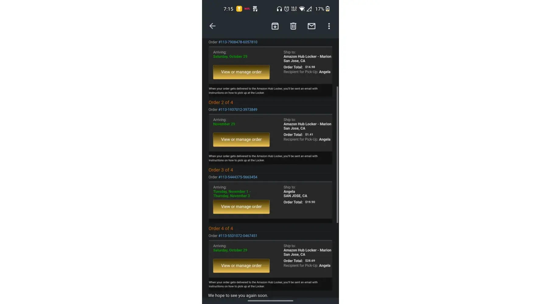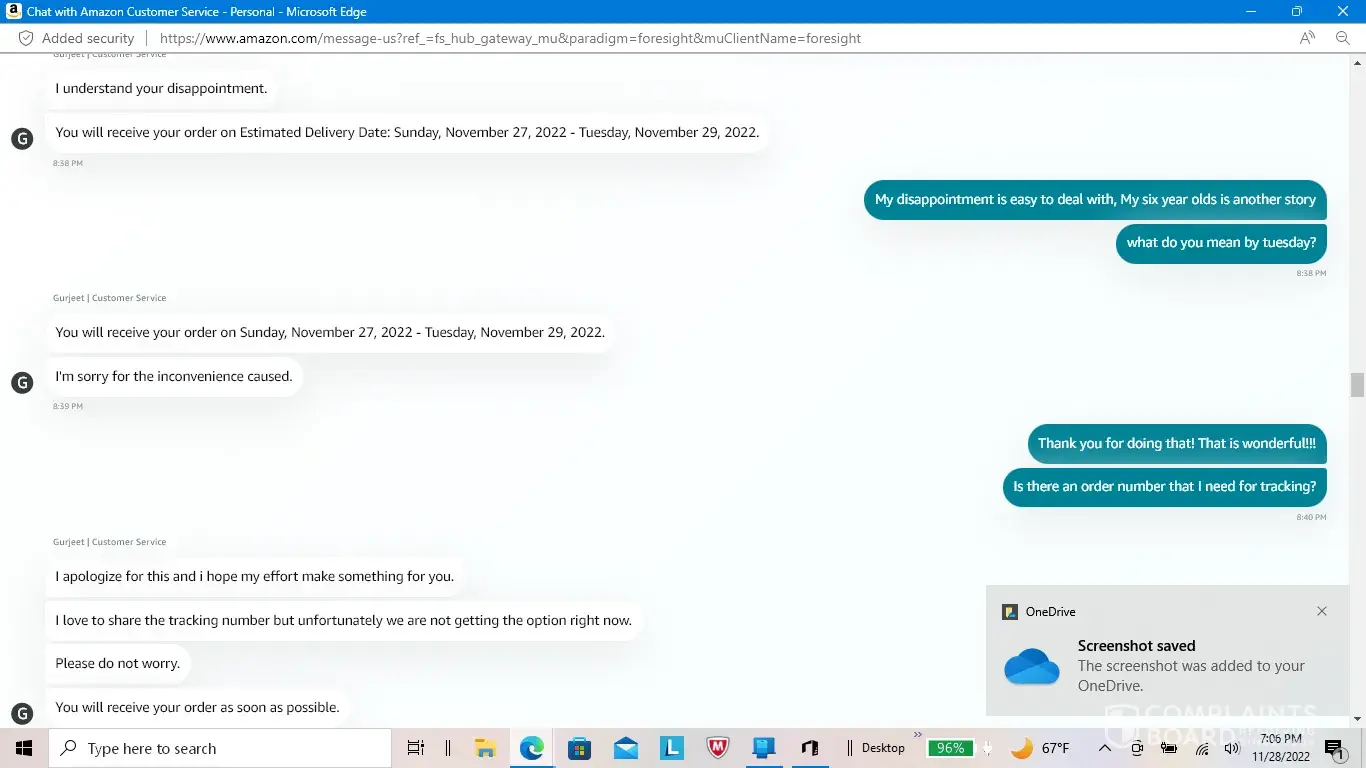 I placed an order on November 16, 2022. The purchase was for a birthday gift for my son that just turned six years old. He wanted the Trac-e robot from the Spidey and His Amazing Friends cartoon show. He was so excited to be getting it that he would ask me every time that I spoke to him. I was also getting a Monster High Doll for my seven year old daughter to replace the one that she had recently lost. I didn't receive any email or other type of notification that my order wasn't going to be shipped due to a payment issue for eleven days. When I got the notification, I no longer had the money to pay for the items. Due to the fact that I had put the money into a friend's account to be able to make the purchase with their card online. They hadn't been able to check their account to see if the money had been taken from their account. I don't have a debit or credit card due to some issues that I am not going to go into. I contacted Amazon's customer service department to find out why it took eleven days for them to notify me about the issue and they eventually told me that my order would be delivered by the 29th of November. I thanked them for taking care of the issue and was under the impression that they were sending the order and covering the costs of the entire order and shipping due to the failure of their system to notify me of the payment issue. I was very appreciative of them compensating me for the issue that had been caused by their automated system's lapse in communication that was going to break my children's hearts. I asked them for the tracking number so that I could let my son and daughter know when to be expecting their gifts. The customer service agent, Gurjeet, told me that he wasn't able to give me that information at that time but that he would email me the details and that I didn't need to worry about it, that it was all taken care of. I left a very nice review and was extremely happy with the outcome that they offered and the issue that didn't need to be stressed about. The next day, I hadn't gotten an email with the details of the order being compensated by them and the tracking number. I did receive an email telling me to update my payment info so that they could ship my order. Confused, I contacted the customer service department again. They told me that they reviewed the chat from the day before and didn't see that Amazon was going to pay for the order and ship it to me. The agent that I chatted with the day before said that my order would be there by the 29th, and that I didn't have to worry about it. That he didn't want to lose an important customer like me and that he was happy that his efforts could help the situation. He didn't actually say that Amazon would cover the costs, he only said that it would be there by the 29th. I was confused as to why I would be told not to worry about the situation and that my order would arrive by the 29th if the cost of it wasn't being covered by Amazon. The agent told me that they sent me two more emails today about the need to update my payment info. He said that there was nothing more that he could do and that he was ending the chat session. I accept the fact that I should have the money to purchase the gift for my children myself and that it is not Amazon's fault that I don't have the money to pay for the gifts at the moment. However, I could have taken care of it before I paid my bills for the month. During the eleven days that it took Amazon to let me know that I needed to take care of an issue with the payment, I had the money to make sure that this didn't happen. The automated system that finally informed me of the issue could have notified me earlier and this whole situation could have been avoided. Confidence in humanity has been destroyed, just like my son's heart because of not getting his birthday gift. THANKS FOR NOTHING AMAZON!