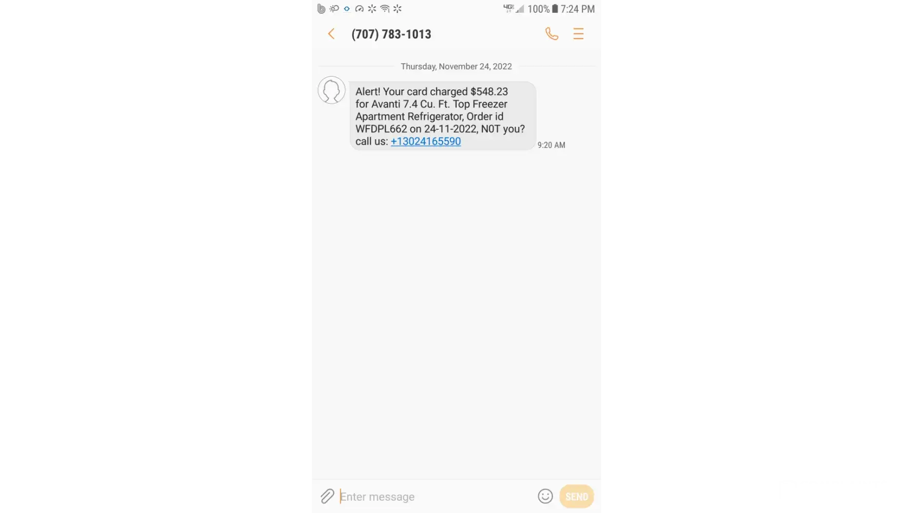 I received a text this morning asking if I purchased a freezer. If not contact - this phone number (See picture of text below). They claimed someone hacked my Amazon account & had also used my credit card to purchase at Sam's & Saks 5th Avenue. They told me to put in my card to Sam's & it will be declined, so "the hackers", will not be able to charge if its declined. I was told to go to a Wal-Mart Supercenter to purchase security gift cards for my phone & laptop & they would pay for it because it was done on the Amazon account. Thank God Wal-Mart was closed for Thanksgiving. They're supposed to contact me tomorrow at 10 am (cst) to go to Wal-Mart to purchase the above. I've locked my credit cards.