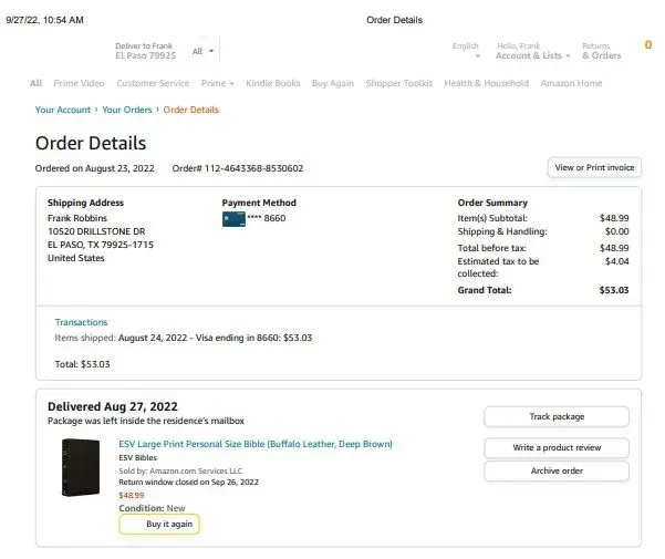 Recieved August 27, 2022. Item(s) Subtotal:$48.99, Shipping & Handling:$0.00, Total before tax:$48.99, Estimated tax to be collected:$4.04, Grand Total:$53.03, Sold by: Amazon.com Services LLC, $48.99, Condition: New. The Bible was not new, after a month of use we started finding markings in the bible. I called Amazon Customer Service on 27-Aug-2022 which indicated the only option was to return the Bible for a refund and pay a stocking fee. We purchased the Bible as new and later found it to be used. At first look, it appeared to be as new Bible until after we used it and later discovered the markings in the Bible by a previous buyer. We believe that when the Bible was represented as new and found to be used, after the return period expired by one day should override the return policy since it was not new after all. Customer Service tried to help but were not able to resolve this issue. You would not think you should go thru 2,813 pages to see if the Bible was new or not. We assumed it was new until later discovered otherwise.