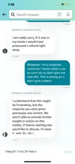 I have been shopping with amazon for years and never had a problem until about 3 years ago and it's been horrible every single time. I will give specifics in a moment. I just have to say one incident 1st. My passed away right before I started school this year, so I got a lot going on to begin with. well with my extra school money I was planning to buy a laptop, headset, mouse, pen, printer and several other accessories. I was going for a graphic design degree at the time so there was a lot of hardware and stuff I needed to do my education efficiently. well, I went on and ordered everything and it took literally all the money I had to do it. I had an important bill come in that day, so I chatted amazon an explained that I really needed everything but since the bill came, I needed to cancel a lot of the order an get a refund. this lady was very chatty, and I didn't mind so I chatted away. I told her about my mom and my bill, and she said since I had been such a loyal long-term customer and been thru such a hard time with amazon services and with my mom's passing, that she would refund the items I asked to cancel but still send the items anyway. I made her repeat it back to me like 3 times because it sounded crazy! I explained to her that I was fixing to spend every bit of the money on my bill an if she was lying to me that I wouldn't be able to buy any of my stuff. she reassured me several times that I was getting all my stuff and my money all for being a good customer and because they had been doing me wrong and I was going thru a lot. well guess what... she lied. I spent the refund on my bill and never got my stuff. I understand it was crazy to believe but I just couldn't see someone being that low to want to know my whole story just to screw me over more.
