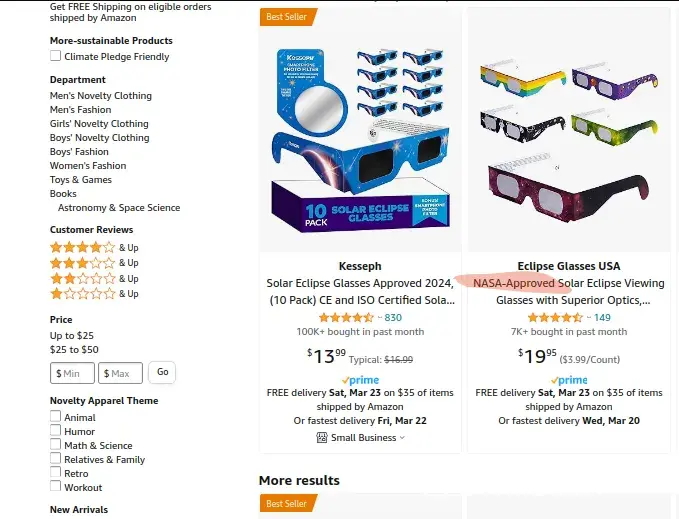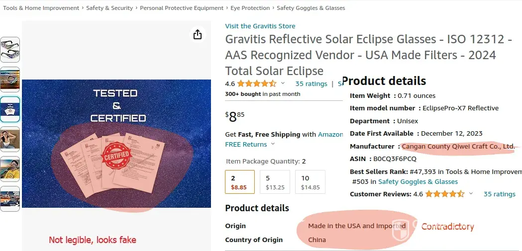 Various eclipse glasses being sold at Amazon site are with questionable standard. These are being sold as “NASA approved” (NASA does not approve any particular brand of solar viewers: https://science.nasa.gov/eclipses/safety/), “AAS approved” (not truthful when not in the list published online: https://eclipse.aas.org/eye-safety/viewers-filters), “ISO certified” (when the certification is illegible) and/or “made is US” (when not), etc. These products, when used by viewers, are serious health hazard, including eye damage and blindness. This is especially concerning when expected number of viewers is a major fraction of US population.