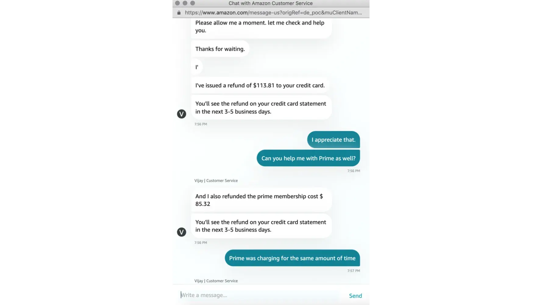 Today, I received notice from my bank that six $14.22 refunds and one $5.99 refund had been issued by Amazon to my credit card. I reached back out to customer service to find out what was going on. This rep apologized for their error and promised to escalate it to their manager.