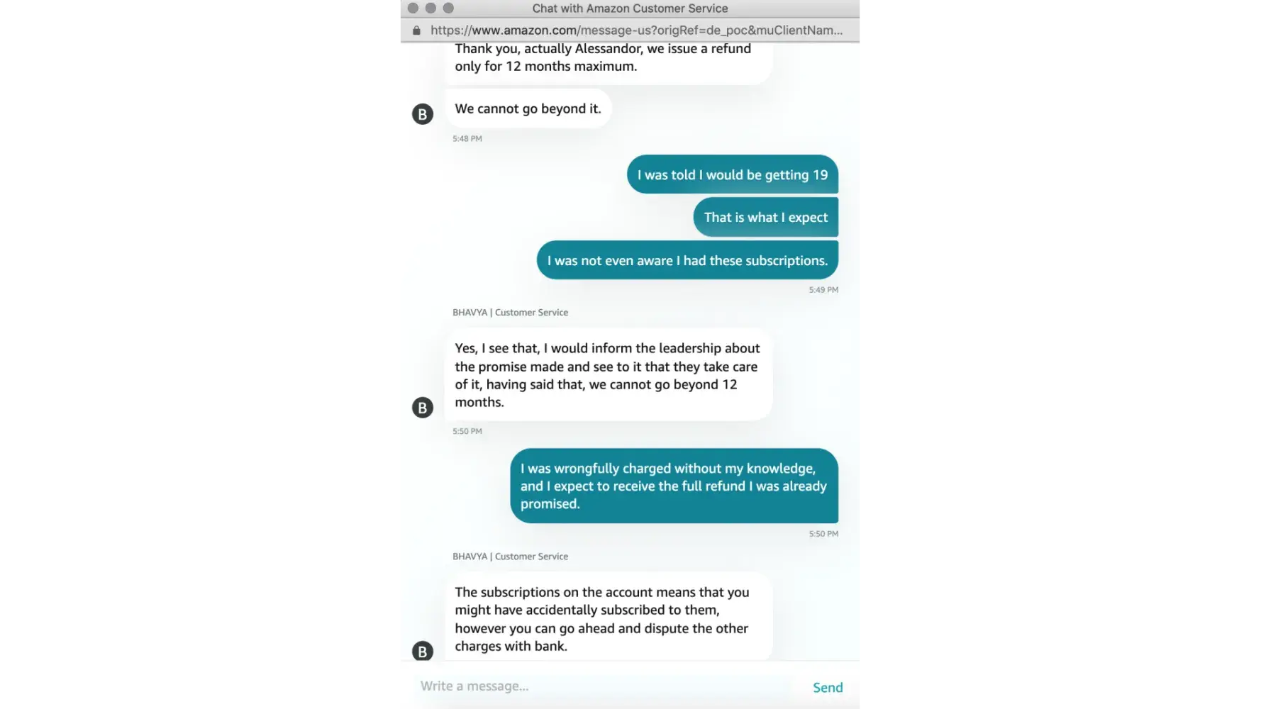 Desired outcome: I would like a full refund of all charges, as promised in writing by Amazon.
