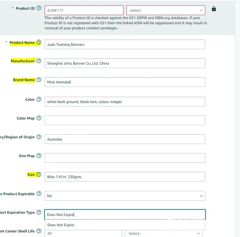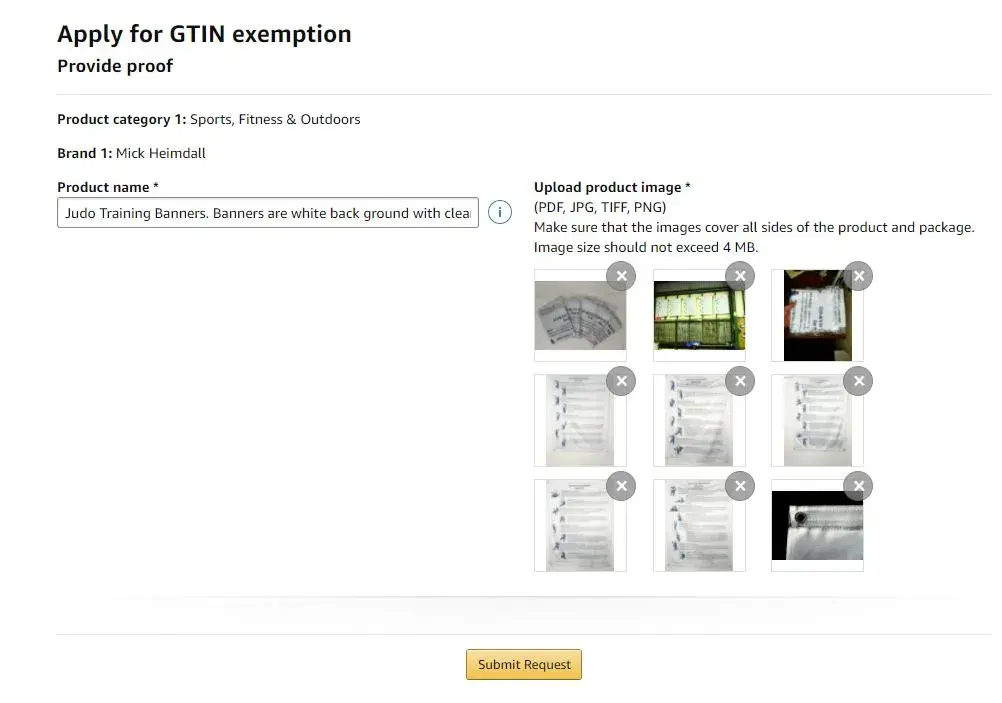 1-my application for GTIN has the incorrect Brand name and product name they do not match my product. my answer is: yes it does, and ive uploaded the same images showing this for the past 9months.