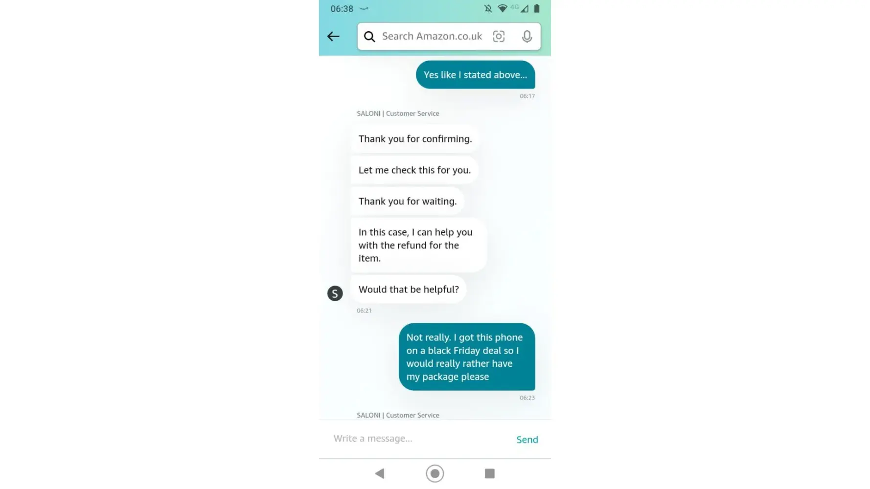 I did this but still no sign, so I again contacted customer services and asked them to resend my item, which they said was not possible. They however instead agreed to a refund for the phone. I explained that this wasn't a good enough solution as I had got it on a black friday deal and as amazon had lied about delivering it I expected them to honour the price I paid. They explained that they couldn't do this exactly due to the item being from a seller and not amazon. I asked how they would resolve it and suggested they make up the difference in price as they had lied about fulfilling the order causing me to be in this situation. The customer services representative agreed to this suggestion. (TURNS OUT LIE 3) I asked how I should go about getting the money afterwards as I didn't trust amazon due to the lies so far. They said I should take a screenshot of the chat as proof, which I did to the best of my ability. I asked for the conversation in an email but apparently this wasn't an option so it did not happen.
