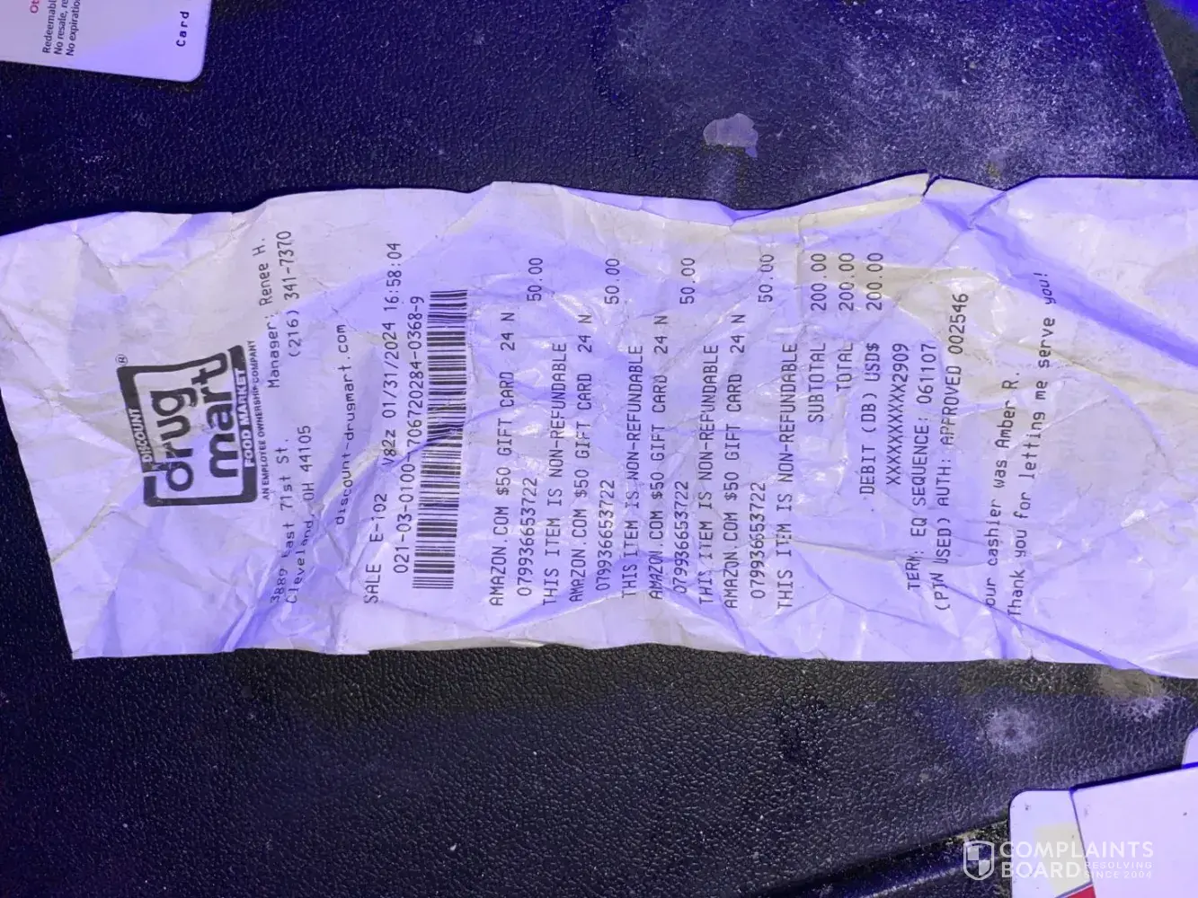 On 1/31/23 I purchased 4 Amazon gift card from a local drugstore because they wouldn’t except my prepaid card. I loaded the cads to my account and tried to make a purchase but they locked my account and won’t refund my money, this was my birthday money, I uploaded everything they asked, receipts, drivers license, bank statements ect and they continued to say it’s not enough information, like it was a robot , now they can’t find my account and my money disappeared into thin air, I still have the cards and receipts , I uploaded the same receipts you see here . How can they not see proof of ownership