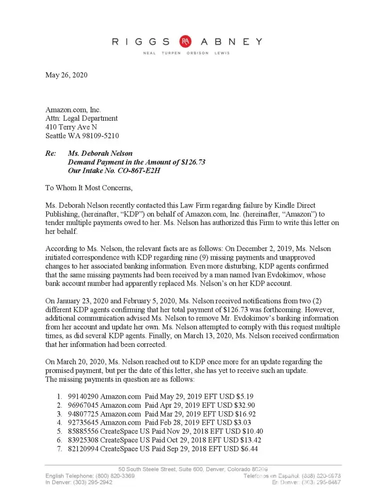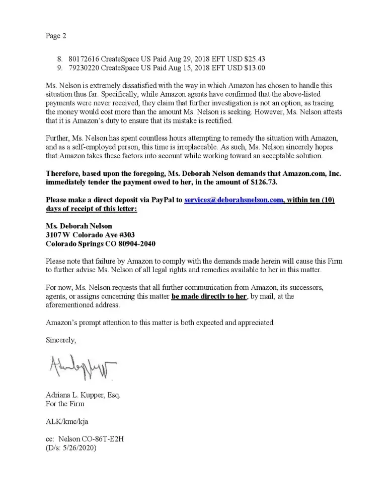 No one at Amazon is resolving my unpaid royalty case — that is why I am contacting you. Even though my attorney contacted the Amazon legal department (Adriana L. Kupper on May 26, 2020), this issue has not been resolved.