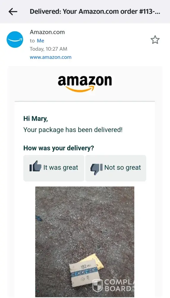 I got an email delivery notification and opened it to a picture of my 2 packages delivered on the ground. I thought they had been left at the end of my driveway and was ready to get in my car to go look, when I saw them in the middle of my driveway where they could be run over. They were 15 feet from my house in the rain on the ground. I took pictures and couldn't believe my packages were left like that. By the time I got the email 11:09 am and looked at it, they were in the driveway in the rain for over 30 minutes as they were dropped off at 10:25 am. Ring doorbell videos do not show the driver ever getting out of the van. My packages were wet and one broke open with the item falling out because it was so wet. I have never been so disgusted by a delivery driver. My account has clear instructions to please leave all deliveries by the door and the video shows plenty of driveway for the driver to do this. This is the absolute worst delivery I have ever had. It reflects very poorly on Amazon and their customer service.