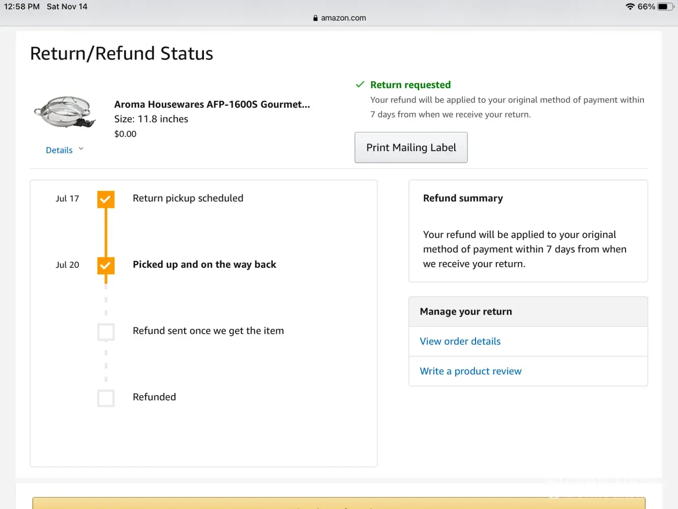 Amazon authorized the return of a damaged electric frying pan. Amazon arranged for and had it picked up by UPS. Amazon's own website shows the item was picked up. Product was delivered to Amazon on July 23, 2020. Amazon denies receiving product. UPS provided proof of delivery and this was provided to Amazon 3 times. Amazon continues to deny receiving the item in spite of UPS proof of delivery and refuses to remove this charge from my credit card. They owe me $58.19