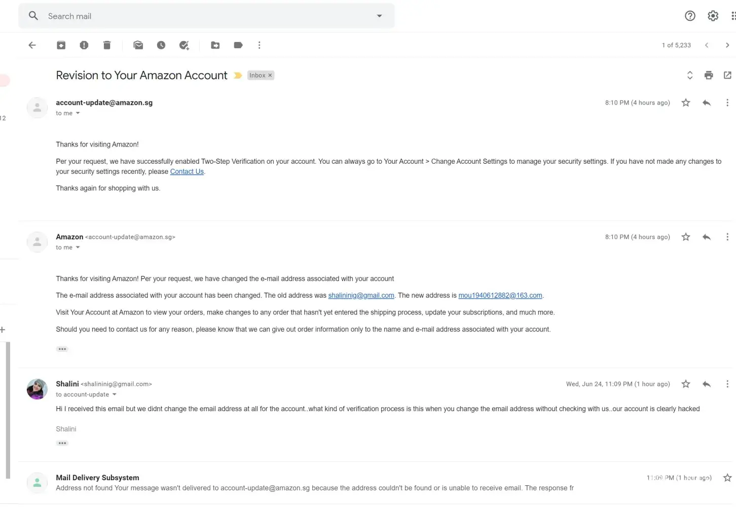 Hi there..i received an email to my account [protected]@gmail.com from amazon saying that someone has hacked my account and has changed my email address. Strangely none of your contact numbers work. Can someone please contact me and please get this sorted as I can no longer access my account. it would be great if someone contacted about the login issue