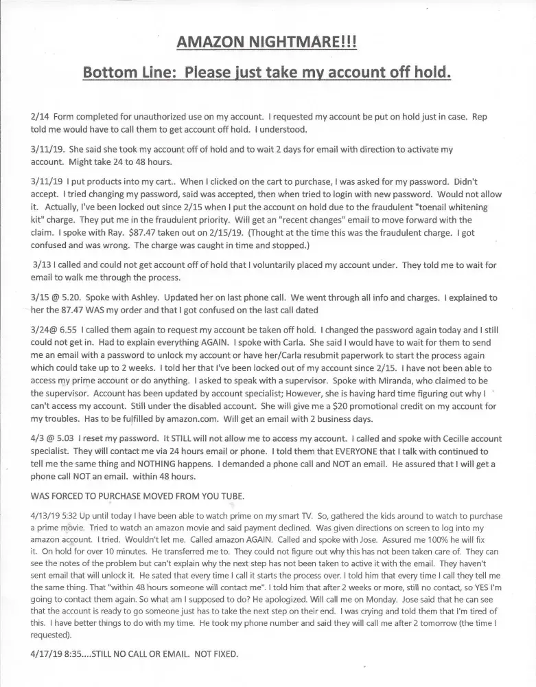 I have contaced them 7 times concerning this and they have still not taken it off of hold. (All notes are below in JPEG) They promise that within 48 hours they will send me an email with directions to fix it. After days or weeks and that doens't happen, I call them again. They then tell me that every time I call it starts the process over again. SO, what am I supposed to do?